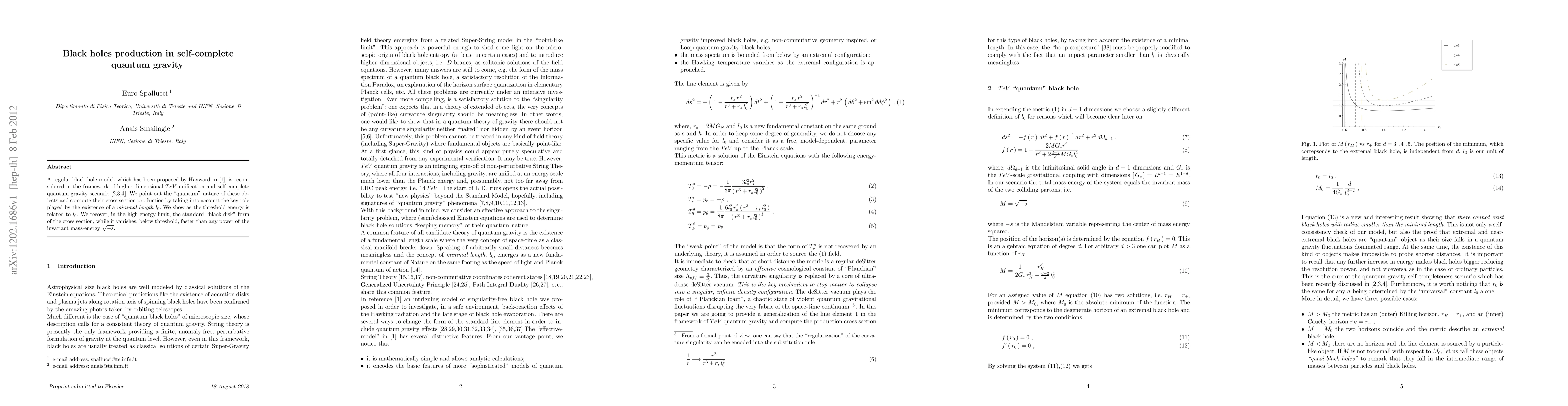 A regular black hole model, which has been proposed by Hayward, is reconsidered in the framework of higher dimensional TeV unification and self-complete quantum gravity scenario (Dvali, Spallucci). We point out the "quantum" nature of these objects and compute their cross section production by taking into account the key role played by the existence of a "minimal length" l_0. We show as the threshold energy is related to l_0. We recover, in the high energy limit, the standard "black-disk" form of the cross section, while it vanishes, below threshold, faster than any power of the invariant mass-energy \sqrt{-s}.