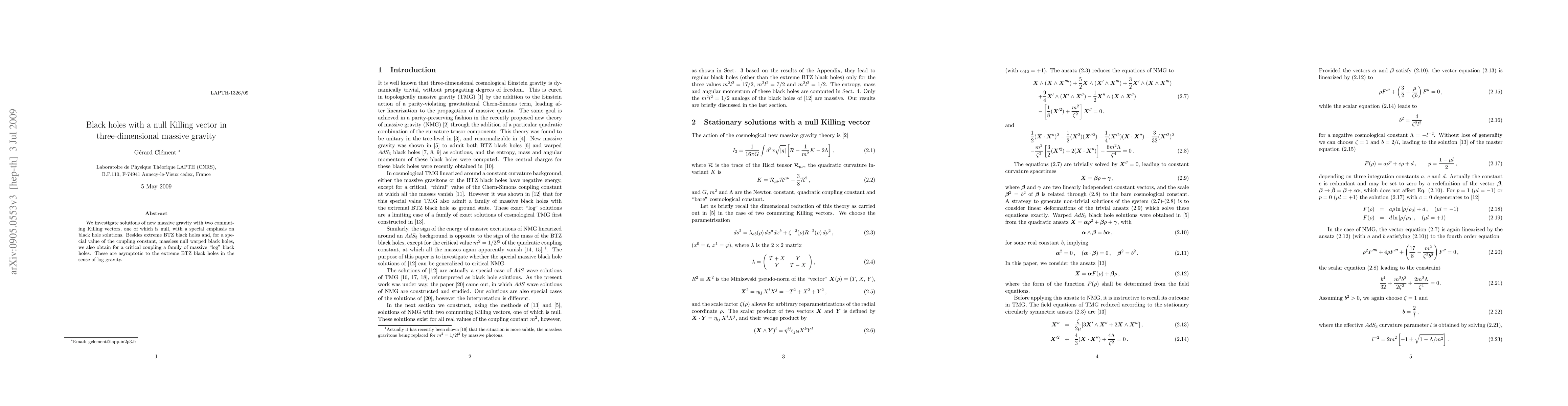 This paper explores black hole solutions in three-dimensional massive gravity with two commuting Killing vectors, one of which is null. It identifies extreme BTZ black holes and a new family of massive "log" black holes for a critical coupling constant.