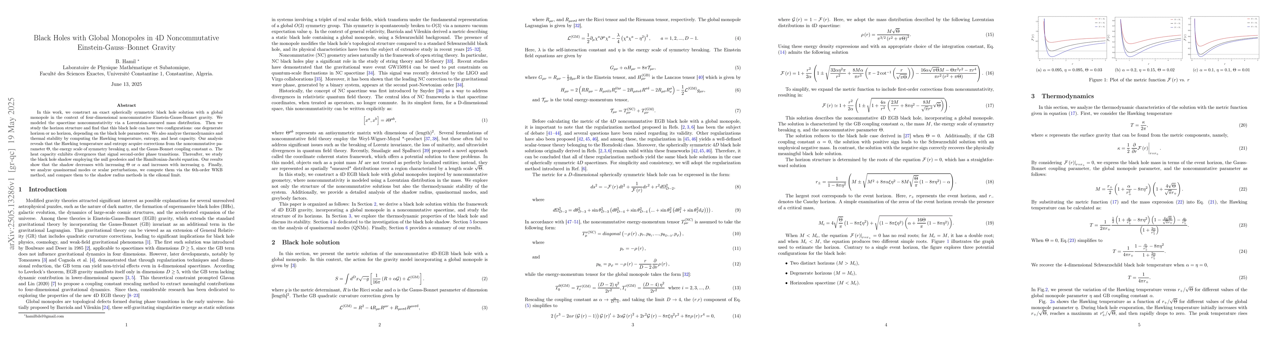 The paper presents an exact black hole solution in noncommutative Einstein-Gauss-Bonnet gravity incorporating a global monopole, alongside detailed thermodynamic, shadow, and quasinormal mode analyses.