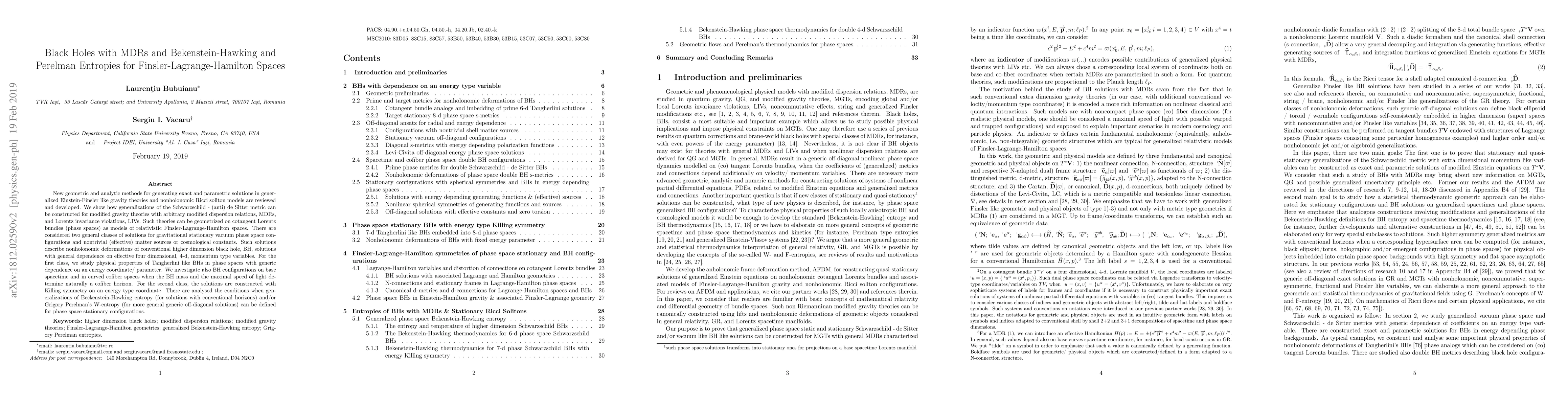 New geometric and analytic methods for generating exact and parametric solutions in generalized Einstein-Finsler like gravity theories and nonholonomic Ricci soliton models are reviewed and developed. We show how generalizations of the Schwarzschild - (anti) de Sitter metric can be constructed for modified gravity theories with arbitrarily modified dispersion relations, MDRs, and Lorentz invariance violations, LIVs. Such theories can be geometrized on cotangent Lorentz bundles (phase spaces) as models of relativistic Finsler-Lagrange-Hamilton spaces. There are considered two general classes of solutions for gravitational stationary vacuum phase space configurations and nontrivial (effective) matter sources or cosmological constants. Such solutions describe nonholonomic deformations of conventional higher dimension black hole, BH, solutions with general dependence on effective four-dimensional, 4-d, momentum type variables. For the first class, we study physical properties of Tangherlini like BHs in phase spaces with generic dependence on an energy coordinate/ parameter. We investigate also BH configurations on base spacetime and in curved cofiber spaces when the BH mass and the maximal speed of light determine naturally a cofiber horizon. For the second class, the solutions are constructed with Killing symmetry on an energy type coordinate. There are analysed the conditions when generalizations of Beckenstein-Hawking entropy (for solutions with conventional horizons) and/or Grigory Perelman's W-entropy (for more general generic off-diagonal solutions) can be defined for phase space stationary configurations.