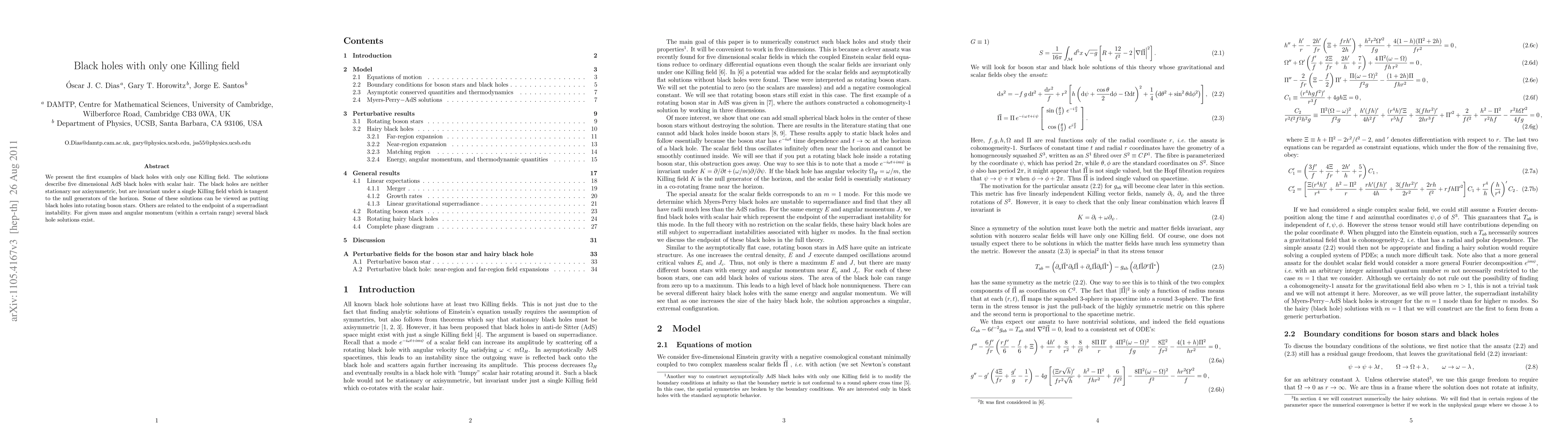 We present the first examples of black holes with only one Killing field. The solutions describe five dimensional AdS black holes with scalar hair. The black holes are neither stationary nor axisymmetric, but are invariant under a single Killing field which is tangent to the null generators of the horizon. Some of these solutions can be viewed as putting black holes into rotating boson stars. Others are related to the endpoint of a superradiant instability. For given mass and angular momentum (within a certain range) several black hole solutions exist.