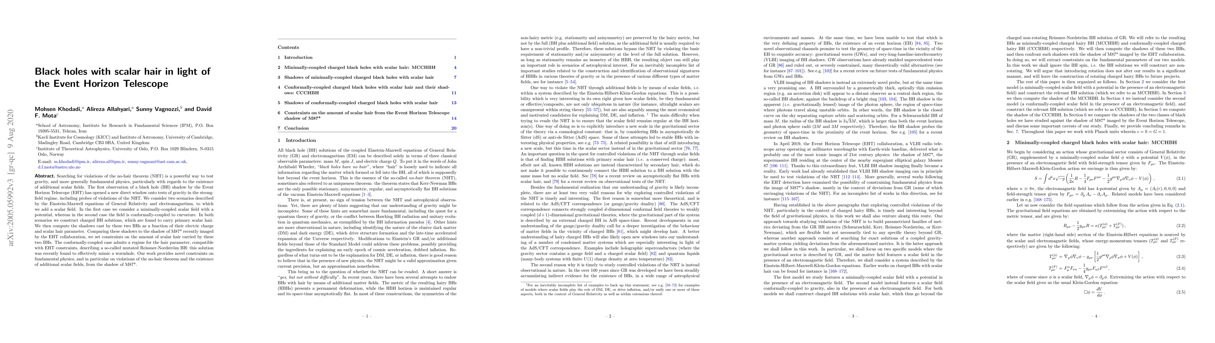 Searching for violations of the no-hair theorem (NHT) is a powerful way to test gravity, and more generally fundamental physics, particularly with regards to the existence of additional scalar fields. The first observation of a black hole (BH) shadow by the Event Horizon Telescope (EHT) has opened a new direct window onto tests of gravity in the strong-field regime, including probes of violations of the NHT. We consider two scenarios described by the Einstein-Maxwell equations of General Relativity and electromagnetism, to which we add a scalar field. In the first case we consider a minimally-coupled scalar field with a potential, whereas in the second case the field is conformally-coupled to curvature. In both scenarios we construct charged BH solutions, which are found to carry primary scalar hair. We then compute the shadows cast by these two BHs as a function of their electric charge and scalar hair parameter. Comparing these shadows to the shadow of M87* recently imaged by the EHT collaboration, we set constraints on the amount of scalar hair carried by these two BHs. The conformally-coupled case admits a regime for the hair parameter, compatible with EHT constraints, describing a so-called mutated Reissner-Nordstr\"{o}m BH: this solution was recently found to effectively mimic a wormhole. Our work provides novel constraints on fundamental physics, and in particular on violations of the no-hair theorem and the existence of additional scalar fields, from the shadow of M87*.