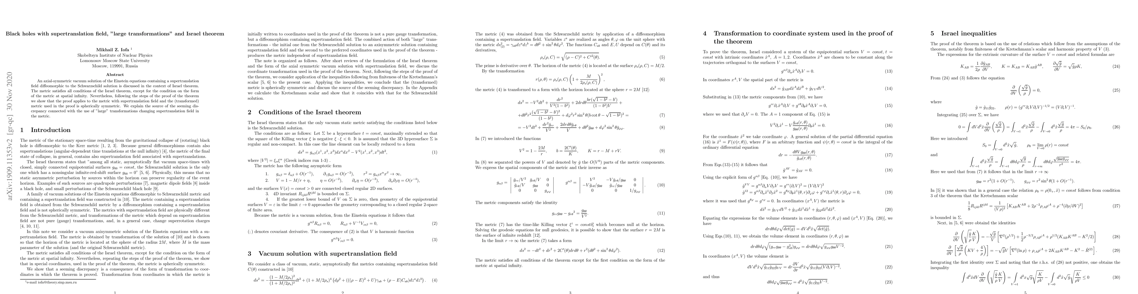 This paper explores an axial-symmetric vacuum solution of Einstein's equations incorporating a supertranslation field, similar to Schwarzschild's solution. Despite not meeting all Israel theorem conditions at spatial infinity, the authors demonstrate through proof steps that the theorem still applies. They clarify discrepancies caused by 'large' transformations altering the supertranslation field in the metric.