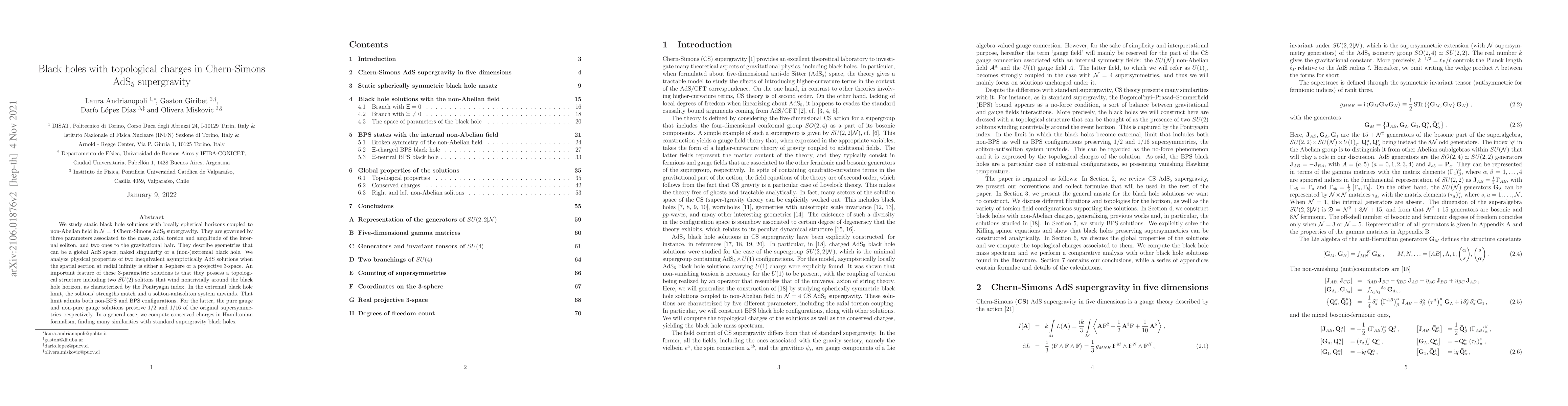 We study static black hole solutions with locally spherical horizons coupled to non-Abelian field in $\mathcal{N}=4$ Chern-Simons AdS$_5$ supergravity. They are governed by three parameters associated to the mass, axial torsion and amplitude of the internal soliton, and two ones to the gravitational hair. They describe geometries that can be a global AdS space, naked singularity or a (non-)extremal black hole. We analyze physical properties of two inequivalent asymptotically AdS solutions when the spatial section at radial infinity is either a 3-sphere or a projective 3-space. An important feature of these 3-parametric solutions is that they possess a topological structure including two $SU(2)$ solitons that wind nontrivially around the black hole horizon, as characterized by the Pontryagin index. In the extremal black hole limit, the solitons' strengths match and a soliton-antisoliton system unwinds. That limit admits both non-BPS and BPS configurations. For the latter, the pure gauge and non-pure gauge solutions preserve $1/2$ and $1/16$ of the original supersymmetries, respectively. In a general case, we compute conserved charges in Hamiltonian formalism, finding many similarities with standard supergravity black holes.