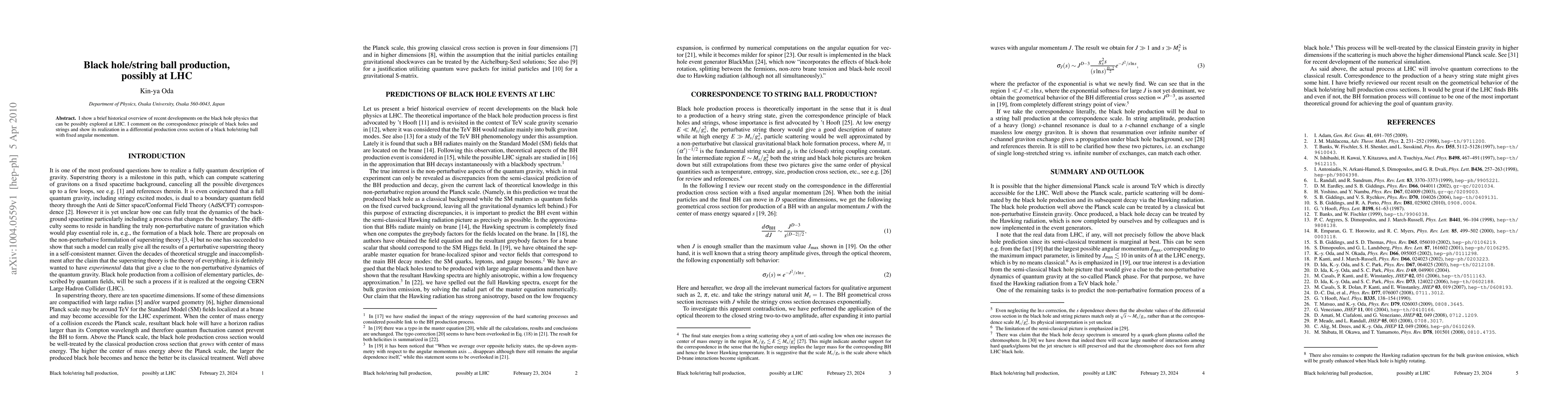 I show a brief historical overview of recent developments on the black hole physics that can be possibly explored at LHC. I comment on the correspondence principle of black holes and strings and show its realization in a differential production cross section of a black hole/string ball with fixed angular momentum.