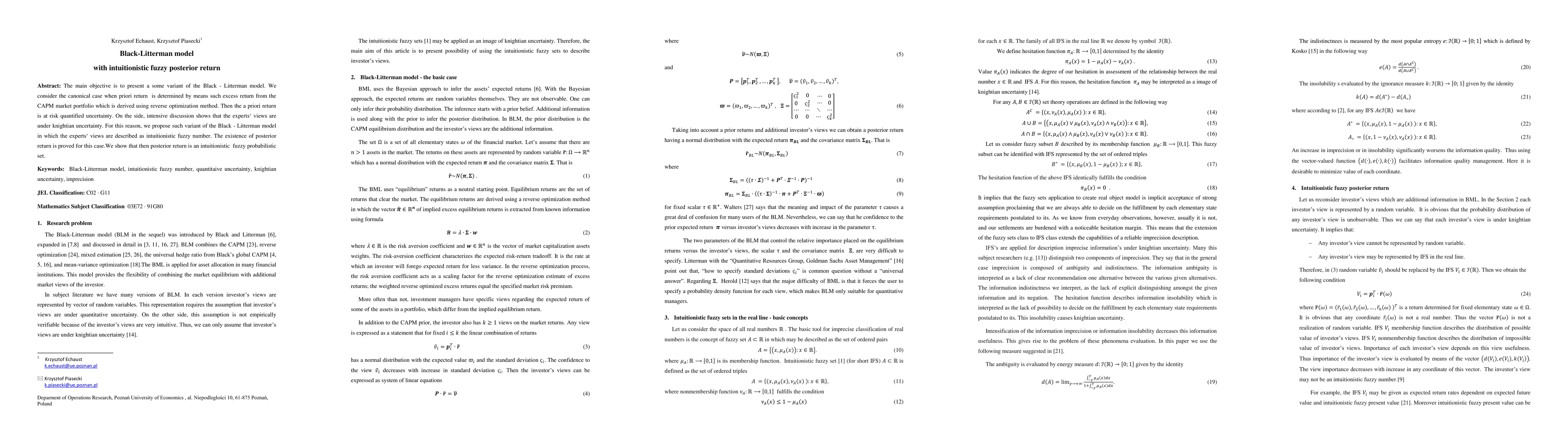 The main objective is to present a some variant of the Black - Litterman model. We consider the canonical case when priori return is determined by means such excess return from the CAPM market portfolio which is derived using reverse optimization method. Then the a priori return is at risk quantified uncertainty. On the side, intensive discussion shows that the experts' views are under knightian uncertainty. For this reason, we propose such variant of the Black - Litterman model in which the experts' views are described as intuitionistic fuzzy number. The existence of posterior return is proved for this case.We show that then posterior return is an intuitionistic fuzzy probabilistic set.