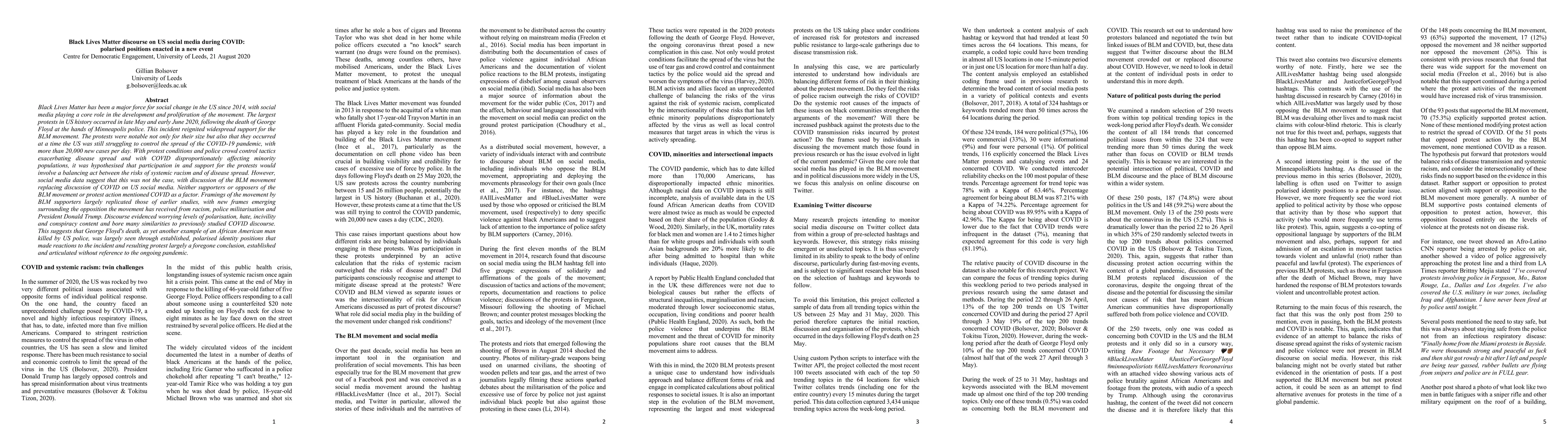 Black Lives Matter has been a major force for social change in the US since 2014, with social media playing a core role in the development and proliferation of the movement. The largest protests in US history occurred in late May and early June 2020, following the death of George Floyd at the hands of Minneapolis police. This incident reignited widespread support for the BLM movement. The protests were notable not only for their size but also that they occurred at a time the US was still struggling to control the spread of the COVID-19 pandemic, with more than 20,000 new cases per day. With protest conditions and police crowd control tactics exacerbating disease spread and with COVID disproportionately affecting minority populations, it was hypothesised that participation in and support for the protests would involve a balancing act between the risks of systemic racism and of disease spread. However, social media data suggest that this was not the case, with discussion of the BLM movement replacing discussion of COVID on US social media. Neither supporters or opposers of the BLM movement or protest action mentioned COVID as a factor. Framings of the movement by BLM supporters largely replicated those of earlier studies, with new frames emerging surrounding the opposition the movement has received from racism, police militarisation and President Donald Trump. Discourse evidenced worrying levels of polarisation, hate, incivility and conspiracy content and bore many similarities to previously studied COVID discourse. This suggests that George Floyd's death, as yet another example of an African American man killed by US police, was largely seen through established, polarised identity positions that made reactions to the incident and resulting protest largely a foregone conclusion, established and articulated without reference to the ongoing pandemic.