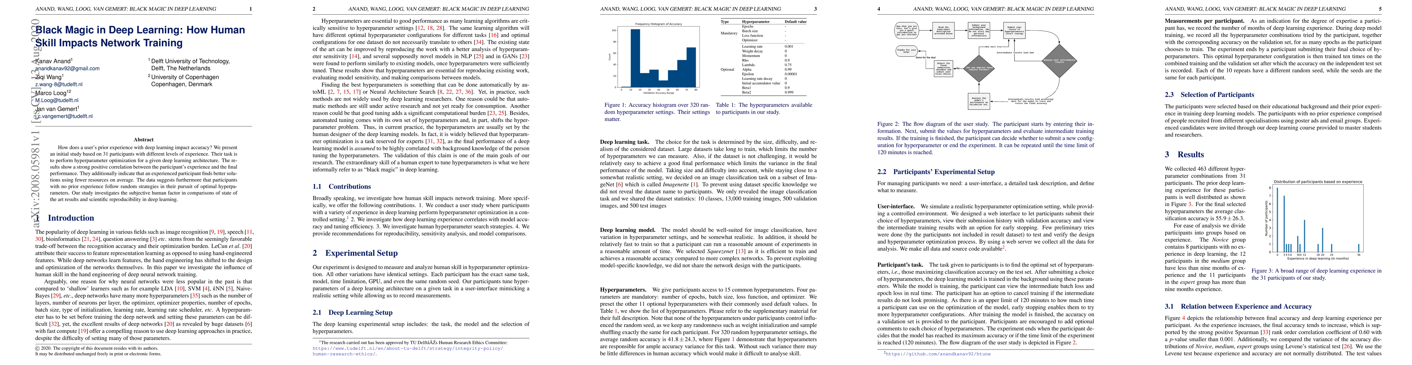 How does a user's prior experience with deep learning impact accuracy? We present an initial study based on 31 participants with different levels of experience. Their task is to perform hyperparameter optimization for a given deep learning architecture. The results show a strong positive correlation between the participant's experience and the final performance. They additionally indicate that an experienced participant finds better solutions using fewer resources on average. The data suggests furthermore that participants with no prior experience follow random strategies in their pursuit of optimal hyperparameters. Our study investigates the subjective human factor in comparisons of state of the art results and scientific reproducibility in deep learning.