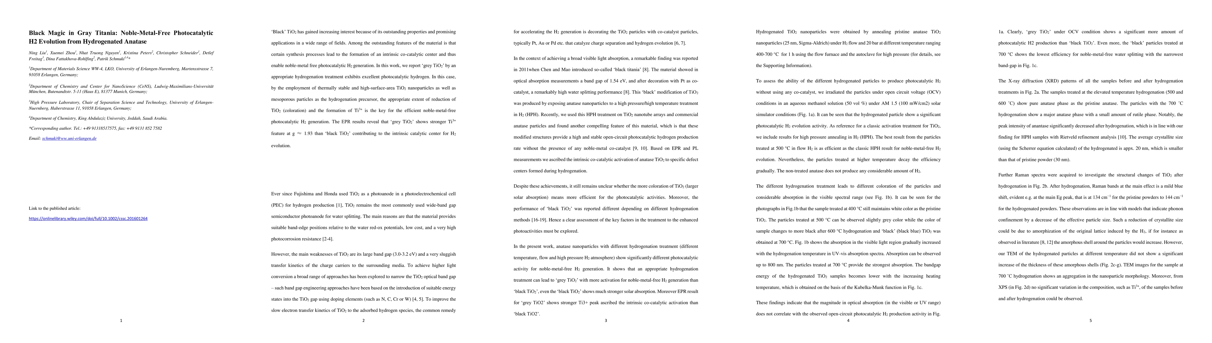 This paper investigates "grey TiO2" synthesized through hydrogenation, demonstrating efficient noble-metal-free photocatalytic hydrogen evolution. The optimal reduction of TiO2 to form Ti3+ centers, revealed by EPR, enhances its catalytic performance compared to "black TiO2."