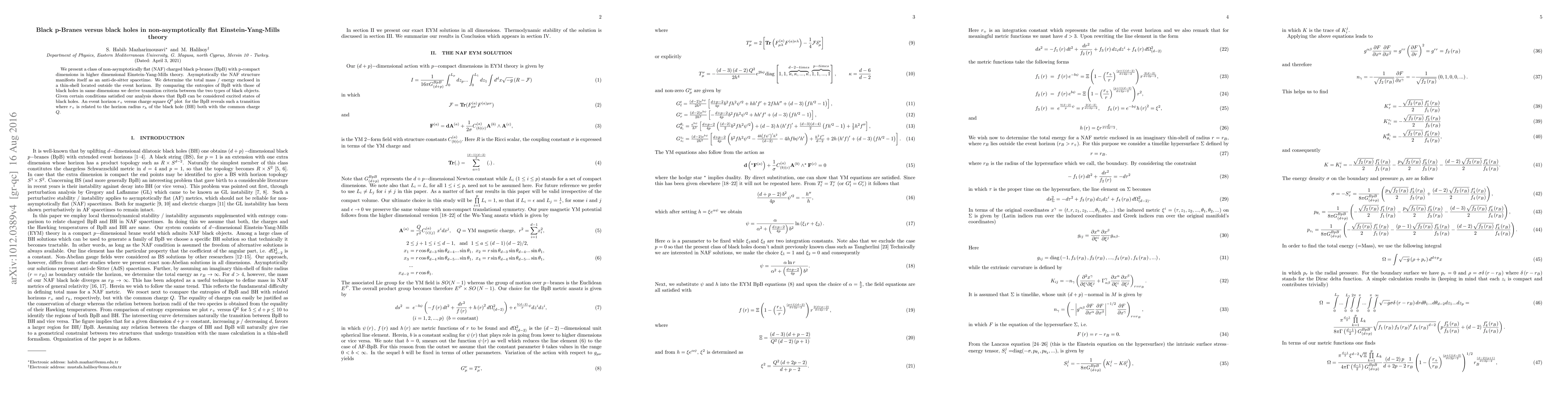 We present a class of non-asymptotically flat (NAF) charged black p-branes (BpB) with p-compact dimensions in higher dimensional Einstein-Yang-Mills theory. Asymptotically the NAF structure manifests itself as an anti-de-sitter spacetime. We determine the total mass / energy enclosed in a thin-shell located outside the event horizon. By comparing the entropies of BpB with those of black holes in same dimensions we derive transition criteria between the two types of black objects. Given certain conditions satisfied our analysis shows that BpB can be considered excited states of black holes. An event horizon $r_{+}$ versus charge square $Q^{2}$ plot \ for the BpB reveals such a transition where $r_{+}$ is related to the horizon radius $r_{h}$ of the black hole (BH) both with the common charge $% Q. $