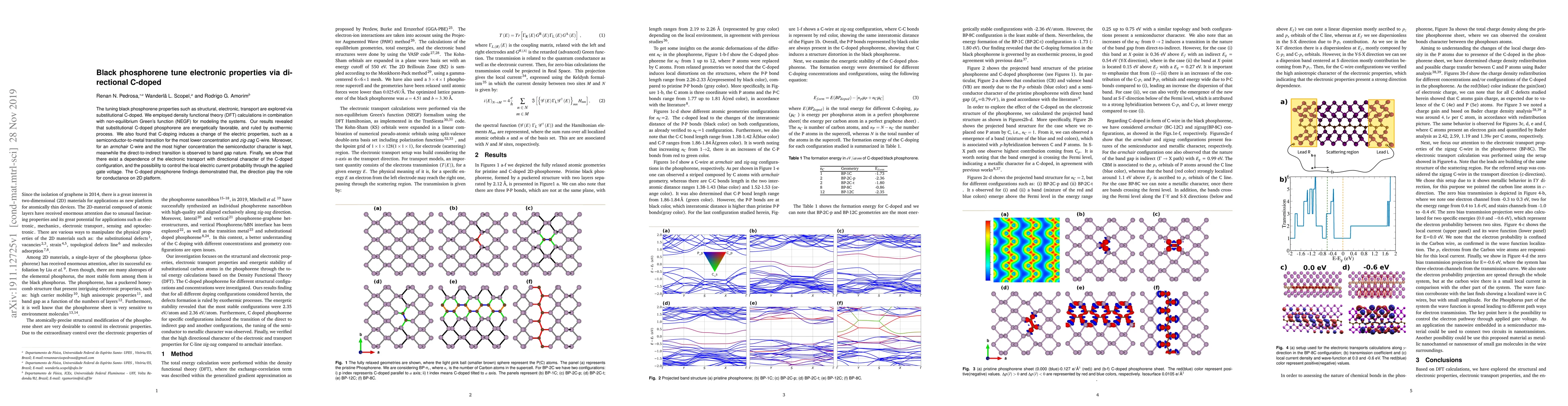 The tuning black phosphorene properties such as structural, electronic, transport are explored via substitutional C-doped. We employed density functional theory (DFT) calculations in combination with non-equilibrium Green's function (NEGF) for modeling the systems. Our results revealed that substitutional C-doped phosphorene are energetically favorable, and ruled by exothermic process. We also found that C-doping induces a change of the electric properties, such as a semiconductor-to-metal transition for the most lower concentration and zig-zag C-wire. Moreover, for an armchair C-wire and the most higher concentration the semiconductor character is kept, meanwhile the direct-to-indirect transition is observed to band gap nature. Finally, we show that there exist a dependence of the electronic transport with directional character of the C-doped configuration, and the possibility to control the local electric current probability through the applied gate voltage. The C-doped phosphorene findings demonstrated that, the direction play the role for conductance on 2D platform.