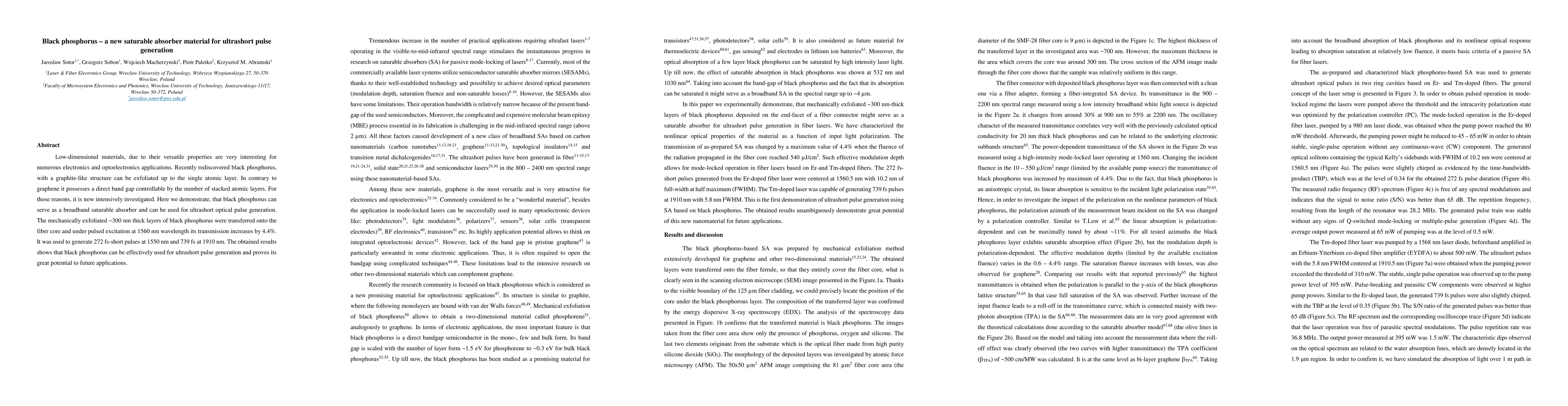 Black phosphorus demonstrates effective broadband saturable absorption properties, enabling the generation of ultrashort optical pulses at 1550 nm and 1910 nm, showcasing its potential for future optoelectronics applications. The material's tunable direct band gap and mechanical exfoliation method highlight its promising use as a new saturable absorber material.