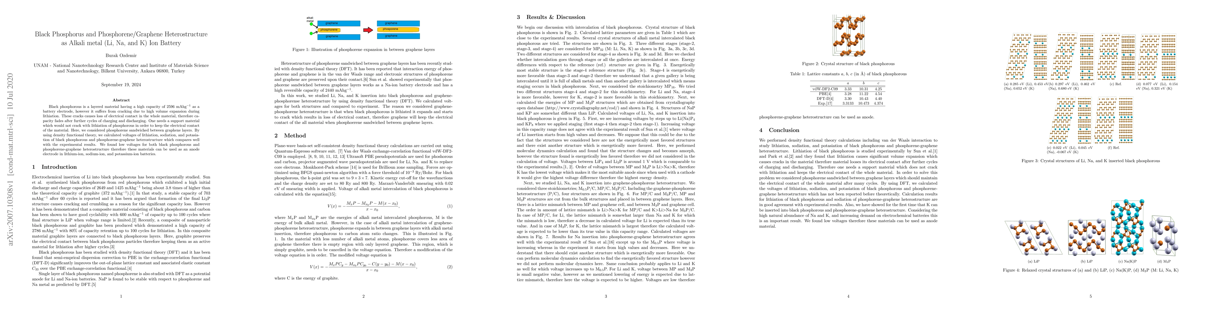 This paper investigates black phosphorus and phosphorene/graphene heterostructures for alkali metal ion batteries, finding that the heterostructure maintains electrical contact despite volume expansion during lithiation, sodiation, and potassiation, thus offering potential as a stable anode electrode. Density functional theory calculations align well with experimental results, indicating low voltages for these materials.