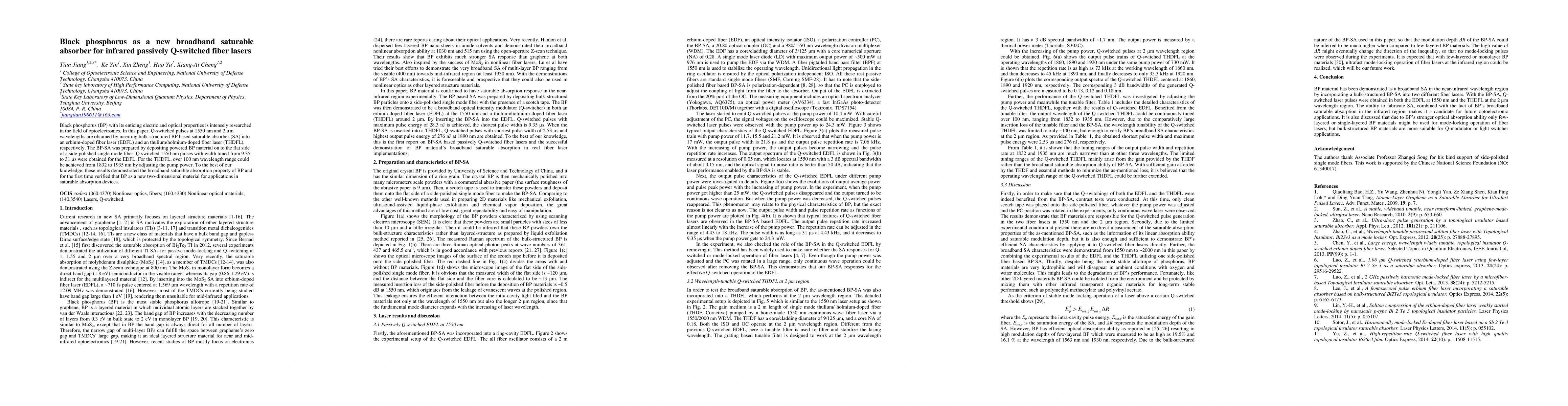 Black phosphorus (BP) is used as a broadband saturable absorber in erbium-doped and thulium/holmium-doped fiber lasers, achieving Q-switched pulses from 1550 nm to 2 um. The study demonstrates BP's potential as a new material for optoelectronic applications due to its tunable pulse width and wavelength range.