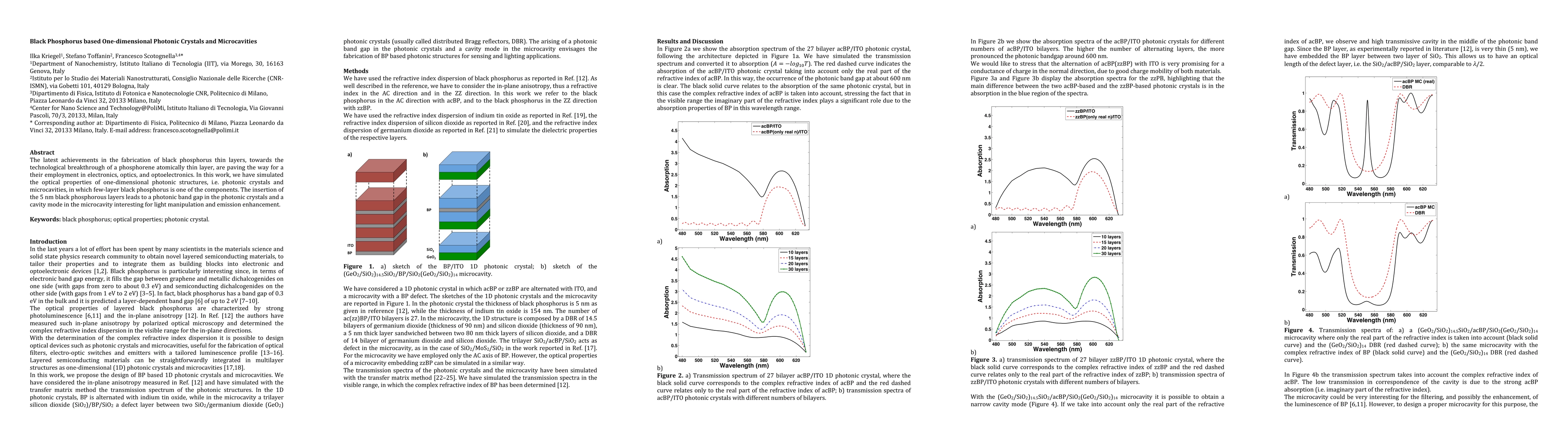 This paper explores the optical properties of one-dimensional photonic crystals and microcavities incorporating few-layer black phosphorus. The study finds that 5 nm black phosphorous layers create a photonic band gap and a cavity mode, promising advancements in light manipulation and emission enhancement.