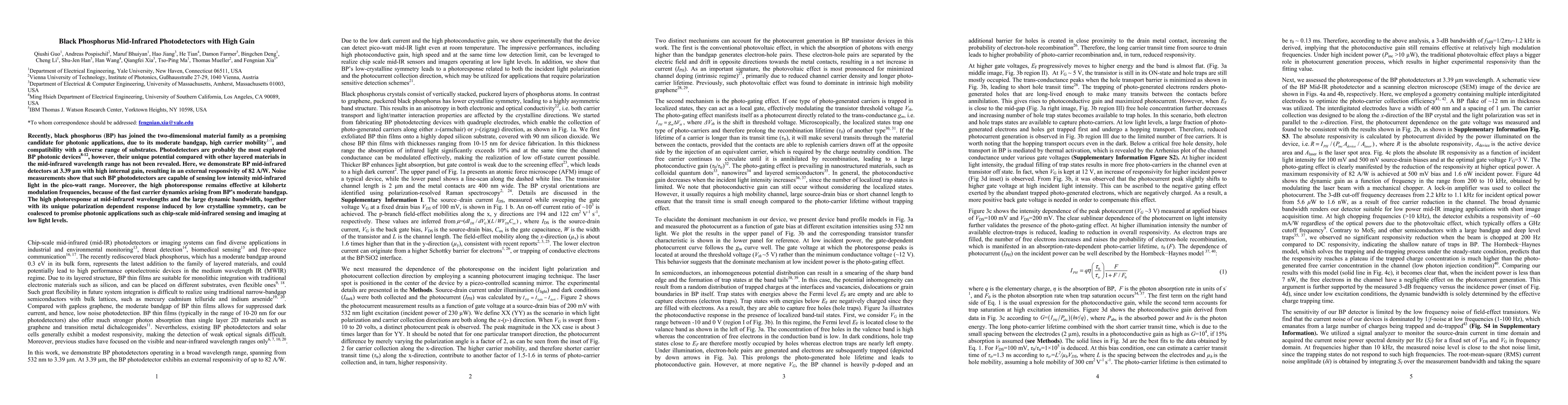 This paper demonstrates black phosphorus mid-infrared photodetectors with high internal gain and responsivity of 82 A/W, capable of sensing picowatt-level mid-infrared light, showcasing potential for low-light level sensing and imaging applications.