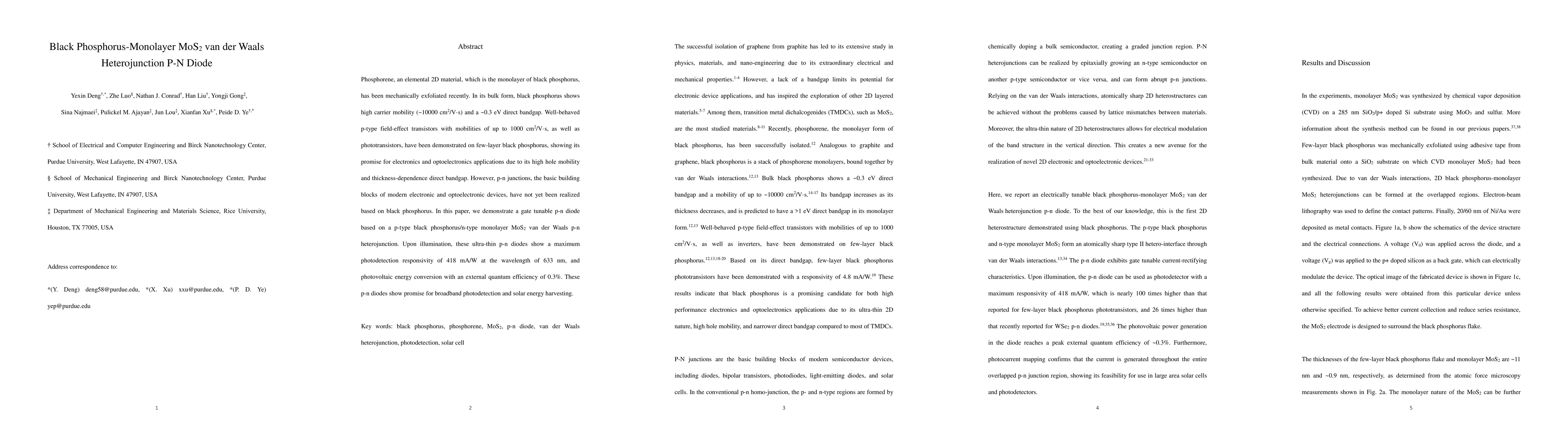 This paper demonstrates a gate-tunable p-n diode using a black phosphorus/monolayer MoS2 van der Waals heterojunction, showing high photodetection responsivity and photovoltaic efficiency, promising for electronic and optoelectronic applications.