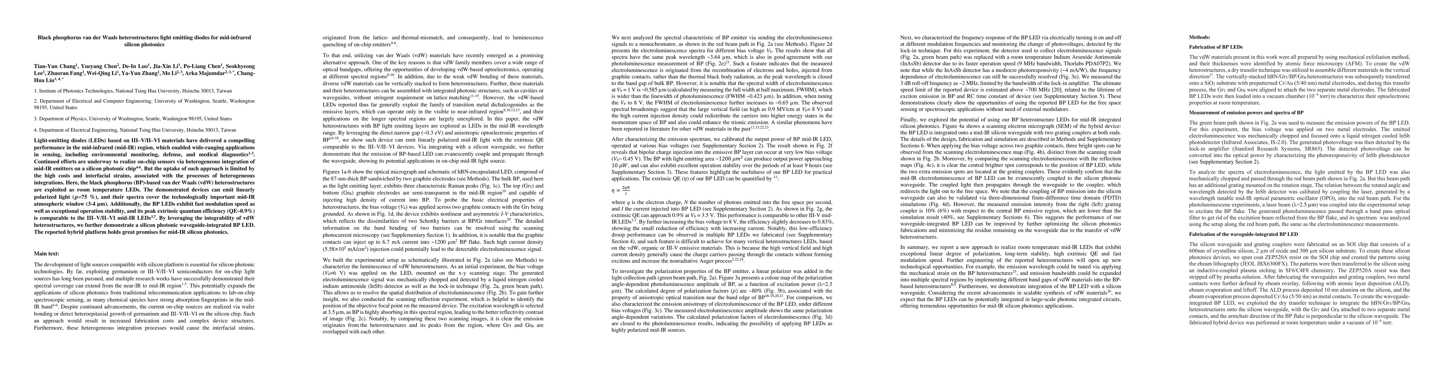 This paper explores black phosphorus van der Waals heterostructures for mid-infrared light-emitting diodes (LEDs) that offer fast modulation, high stability, and comparable quantum efficiency to traditional III-V/II-VI materials. The integration of these BP LEDs with silicon photonic waveguides presents a promising platform for on-chip mid-IR sensors.