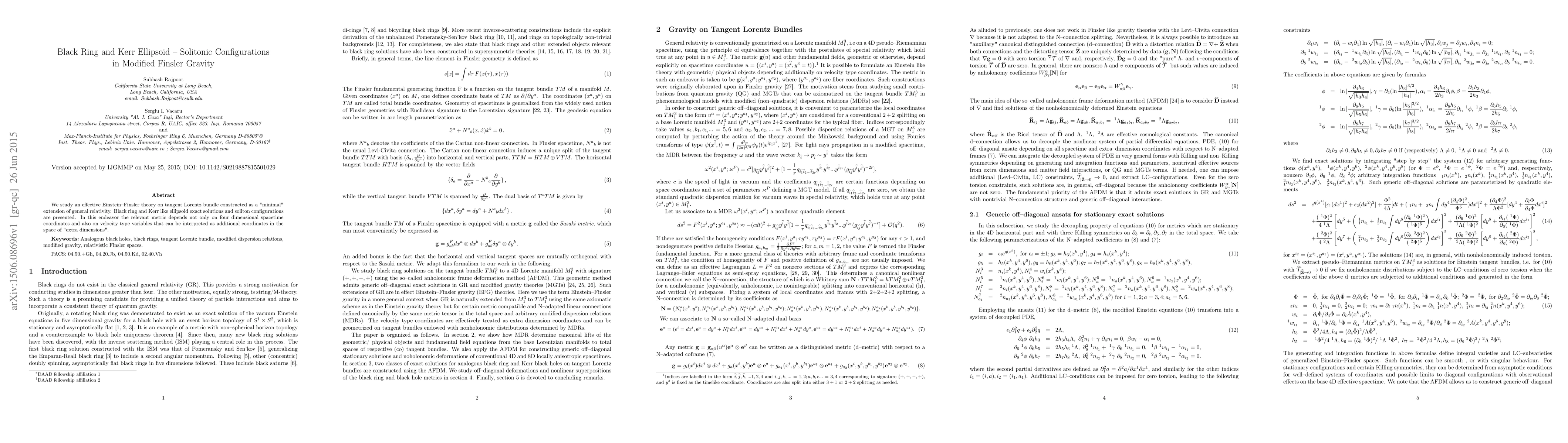 We study an effective Einstein-Finsler theory on tangent Lorentz bundle constructed as a "minimal" extension of general relativity. Black ring and Kerr like ellipsoid exact solutions and soliton configurations are presented. In this endeavor the relevant metric depends not only on four dimensional spacetime coordinates and also on velocity type variables that can be interpreted as additional coordinates in the space of "extra dimensions".