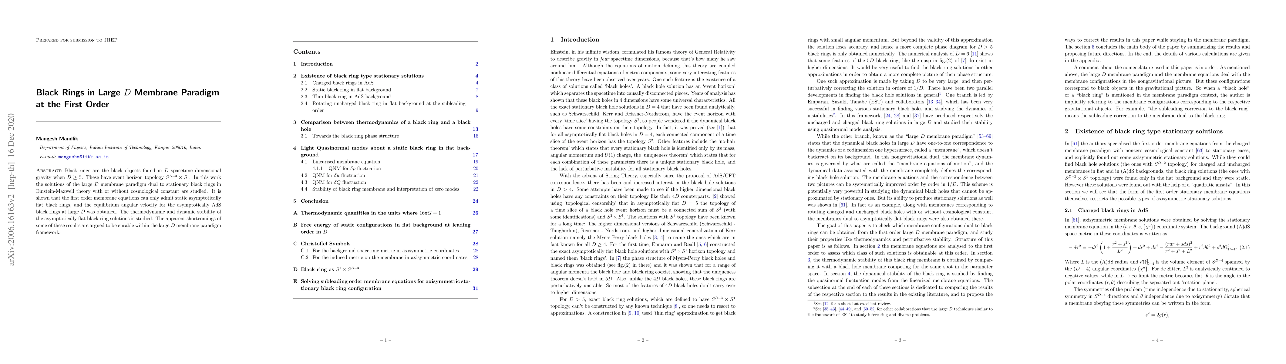 This paper investigates the large $D$ membrane paradigm dual to stationary black rings in Einstein-Maxwell theory, demonstrating that first-order membrane equations only admit static, asymptotically flat black rings. It also explores the thermodynamic and dynamic stability of these solutions, suggesting that apparent issues can be resolved within the large $D$ framework.
