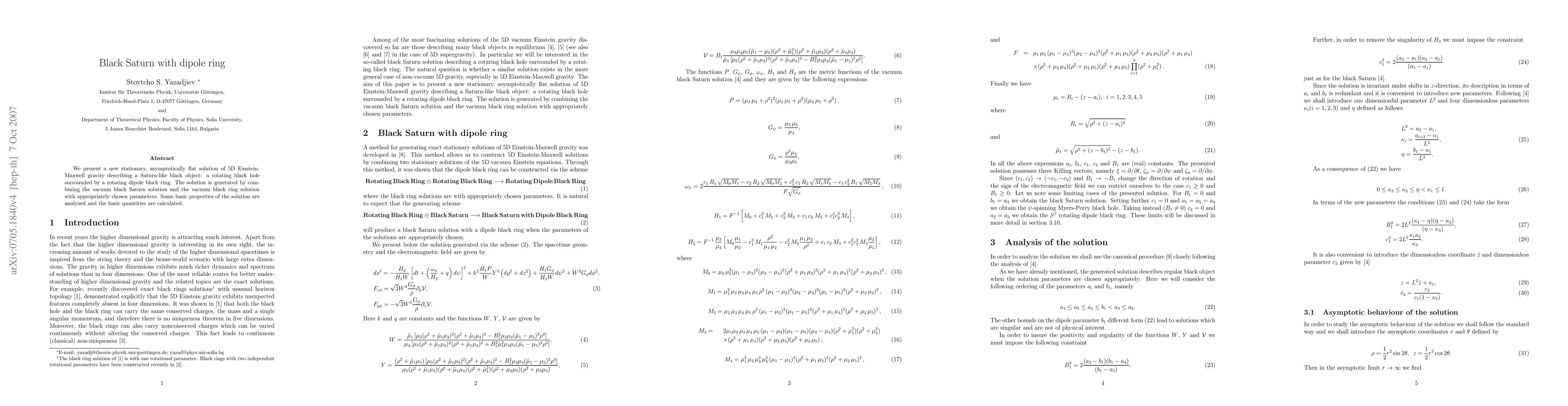 This paper introduces a new 5D Einstein-Maxwell gravity solution for a rotating black hole encircled by a rotating dipole ring, combining existing black Saturn and black ring solutions. Basic properties and quantities of the new configuration are analyzed.