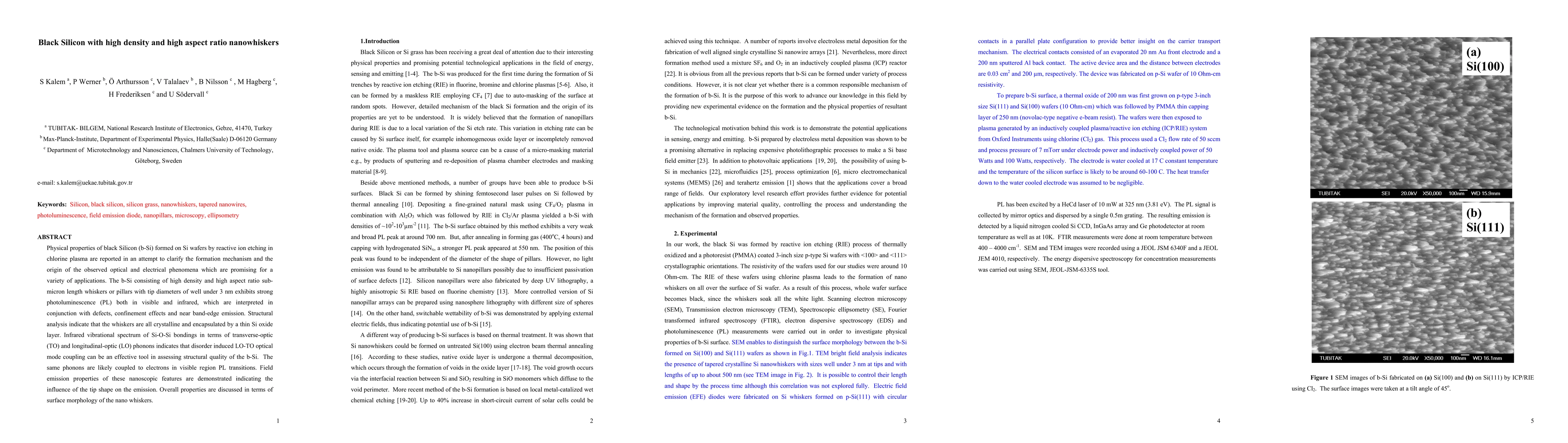 This paper investigates the physical properties of black silicon formed via reactive ion etching, focusing on its high density and high aspect ratio nanowhiskers. The study reveals strong photoluminescence and field emission properties, attributing these phenomena to crystalline whiskers and their oxide layer, with implications for various applications.