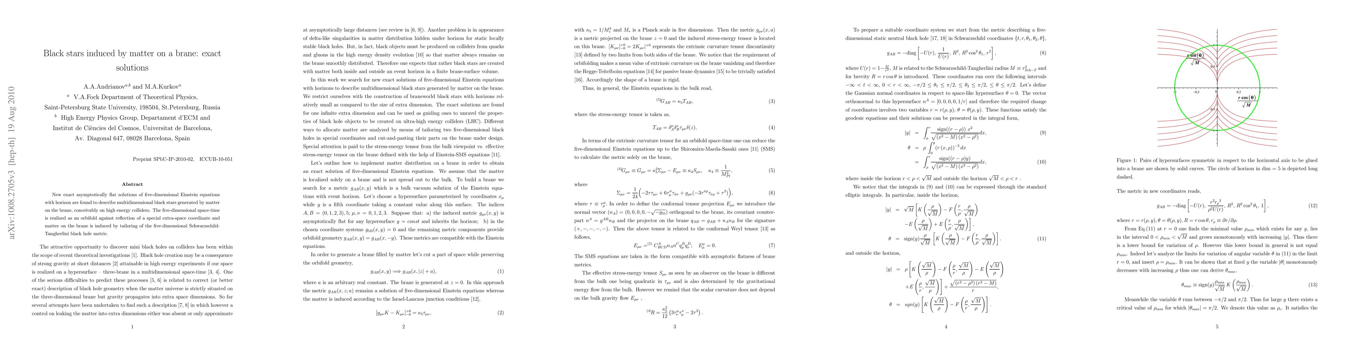 New exact asymptotically flat solutions of five-dimensional Einstein equations with horizon are found to describe multidimensional black stars generated by matter on the brane, conceivably on high energy colliders. The five-dimensional space-time is realized as an orbifold against reflection of a special extra-space coordinate and matter on the brane is induced by tailoring of the five-dimensional Schwarzschild-Tangherlini black hole metric.