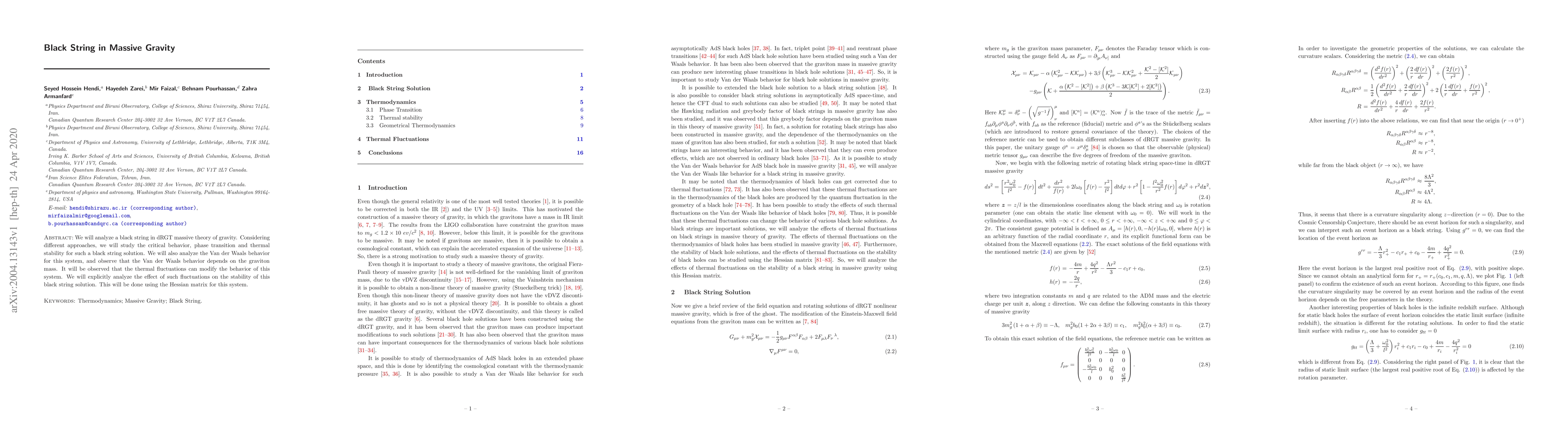 We will analyze a black string in dRGT massive theory of gravity. Considering different approaches, we will study the critical behavior, phase transition and thermal stability for such a black string solution. We will also analyze the Van der Waals behavior for this system, and observe that the Van der Waals behavior depends on the graviton mass. It will be observed that the thermal fluctuations can modify the behavior of this system. We will explicitly analyze the effect of such fluctuations on the stability of this black string solution. This will be done using the Hessian matrix for this system.
