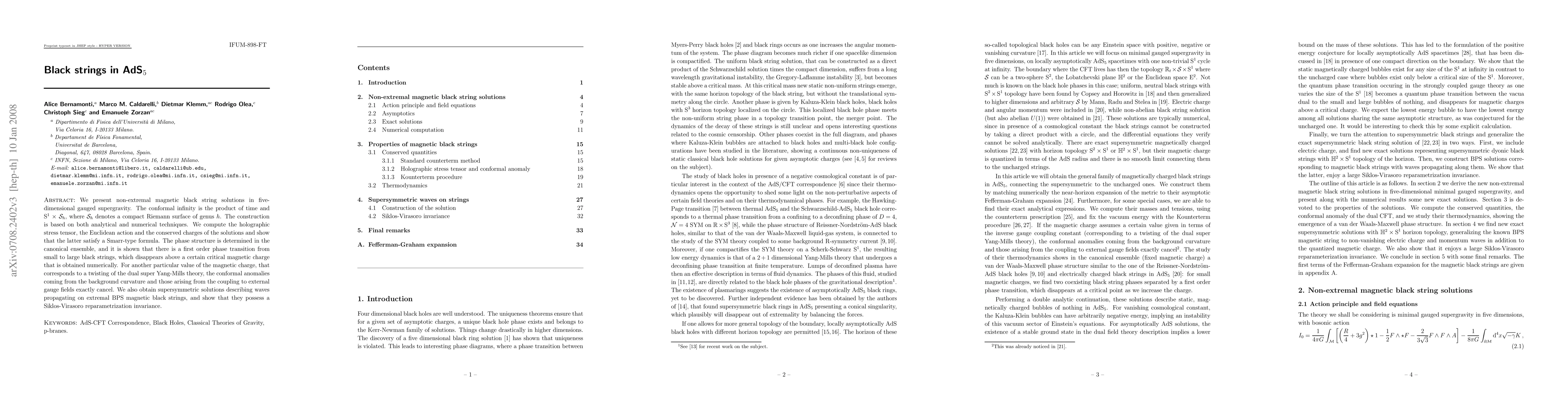 We present non-extremal magnetic black string solutions in five-dimensional gauged supergravity. The conformal infinity is the product of time and S^1xS_h, where S_h denotes a compact Riemann surface of genus h. The construction is based on both analytical and numerical techniques. We compute the holographic stress tensor, the Euclidean action and the conserved charges of the solutions and show that the latter satisfy a Smarr-type formula. The phase structure is determined in the canonical ensemble, and it is shown that there is a first order phase transition from small to large black strings, which disappears above a certain critical magnetic charge that is obtained numerically. For another particular value of the magnetic charge, that corresponds to a twisting of the dual super Yang-Mills theory, the conformal anomalies coming from the background curvature and those arising from the coupling to external gauge fields exactly cancel. We also obtain supersymmetric solutions describing waves propagating on extremal BPS magnetic black strings, and show that they possess a Siklos-Virasoro reparametrization invariance.