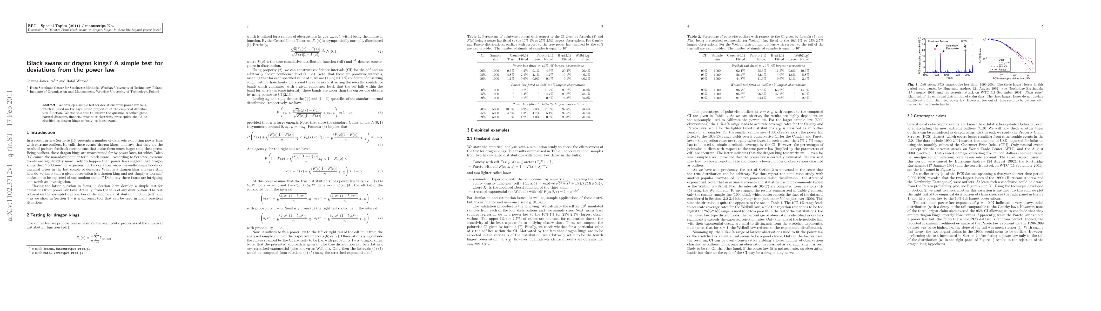 Summary: This paper introduces a straightforward test to detect deviations from power law distributions, using the empirical distribution function's asymptotic properties. It applies this test to determine if extreme events like natural disasters and financial crashes are best described as "dragon kings" or merely "black swans."