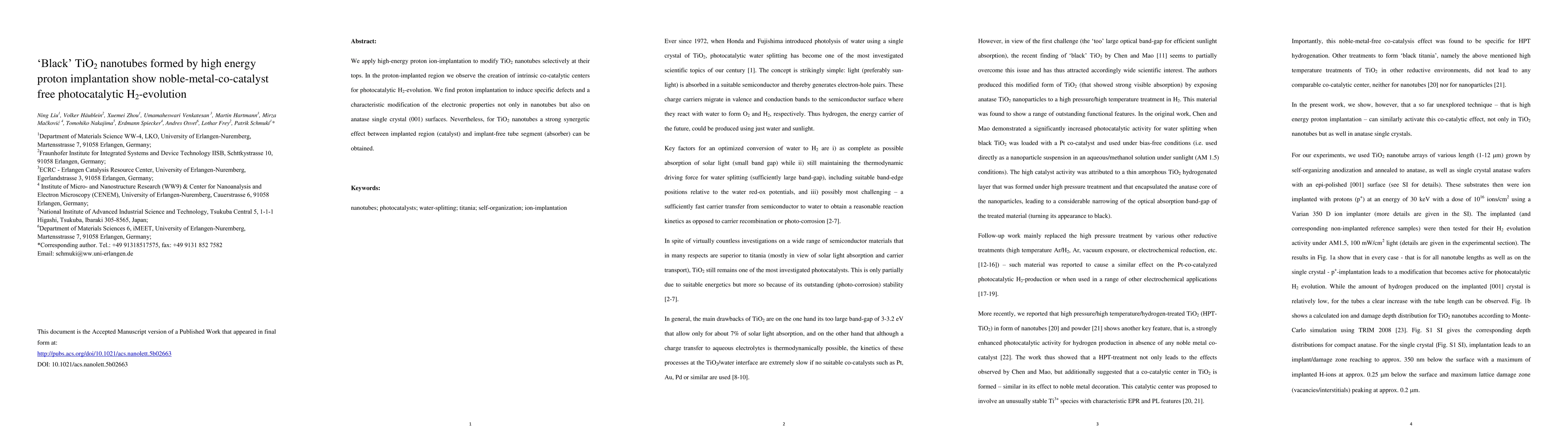 This paper demonstrates that high-energy proton implantation on TiO2 nanotubes creates intrinsic co-catalytic centers, enabling noble-metal-co-catalyst-free photocatalytic H2 evolution. The implantation induces specific defects and modifies electronic properties, achieving a strong synergetic effect between the implanted catalyst region and the non-implanted absorber segment.