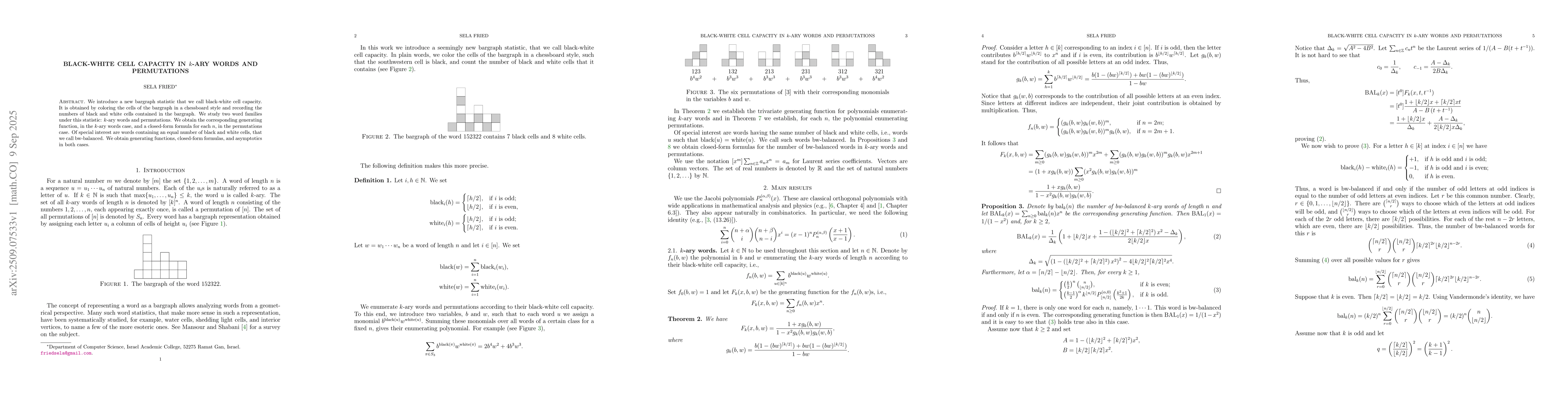 We introduce a new bargraph statistic that we call black-white cell capacity. It is obtained by coloring the cells of the bargraph in a chessboard style and recording the numbers of black and white cells contained in the bargraph. We study two word families under this statistic: $k$-ary words and permutations. We obtain the corresponding generating function, in the $k$-ary words case, and a closed-form formula for each $n$, in the permutations case. Of special interest are words containing an equal number of black and white cells, that we call bw-balanced. We obtain generating functions, closed-form formulas, and asymptotics in both cases.