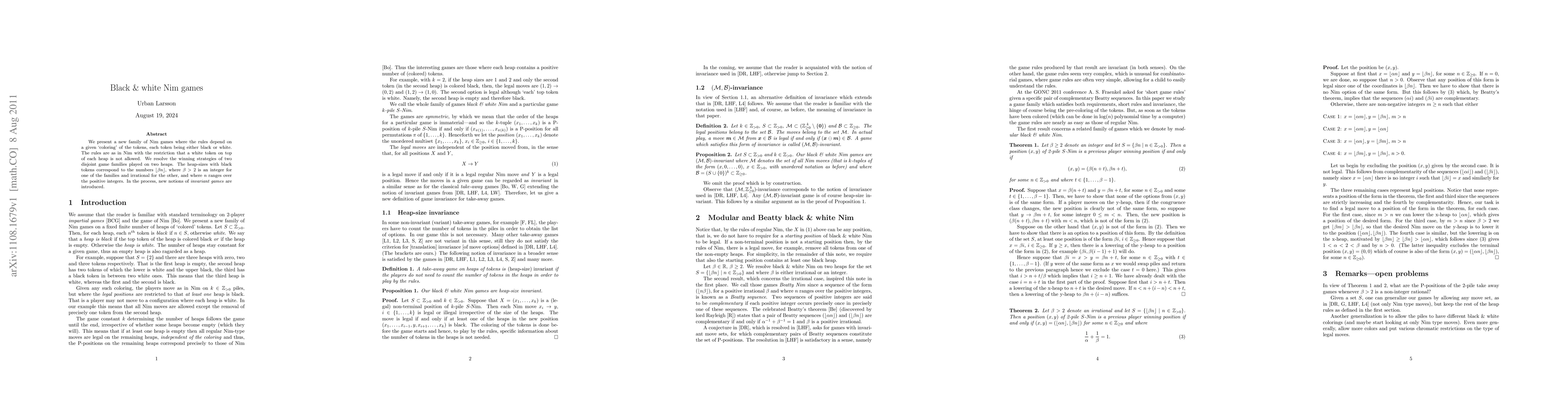 We present a new family of Nim games where the rules depend on a given `coloring' of the tokens, each token being either black or white. The rules are as in Nim with the restriction that a white token on top of each heap is not allowed. We resolve the winning strategies of two disjoint game families played on two heaps. The heap-sizes with black tokens correspond to the numbers $\lfloor \beta n \rfloor$, where $\beta>2$ is an integer for one of the families and irrational for the other, and where $n$ ranges over the positive integers. In the process, new notions of \emph{invariant games} are introduced.