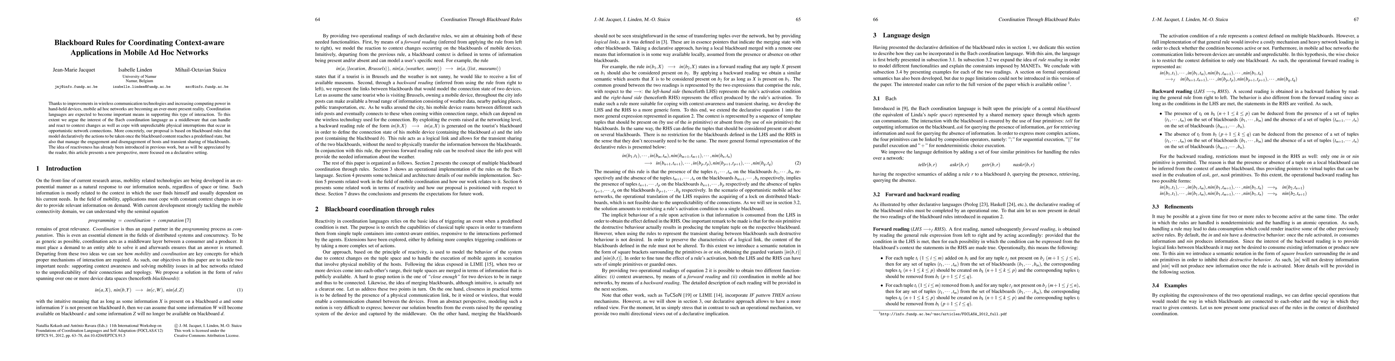 Thanks to improvements in wireless communication technologies and increasing computing power in hand-held devices, mobile ad hoc networks are becoming an ever-more present reality. Coordination languages are expected to become important means in supporting this type of interaction. To this extent we argue the interest of the Bach coordination language as a middleware that can handle and react to context changes as well as cope with unpredictable physical interruptions that occur in opportunistic network connections. More concretely, our proposal is based on blackboard rules that model declaratively the actions to be taken once the blackboard content reaches a predefined state, but also that manage the engagement and disengagement of hosts and transient sharing of blackboards. The idea of reactiveness has already been introduced in previous work, but as will be appreciated by the reader, this article presents a new perspective, more focused on a declarative setting.