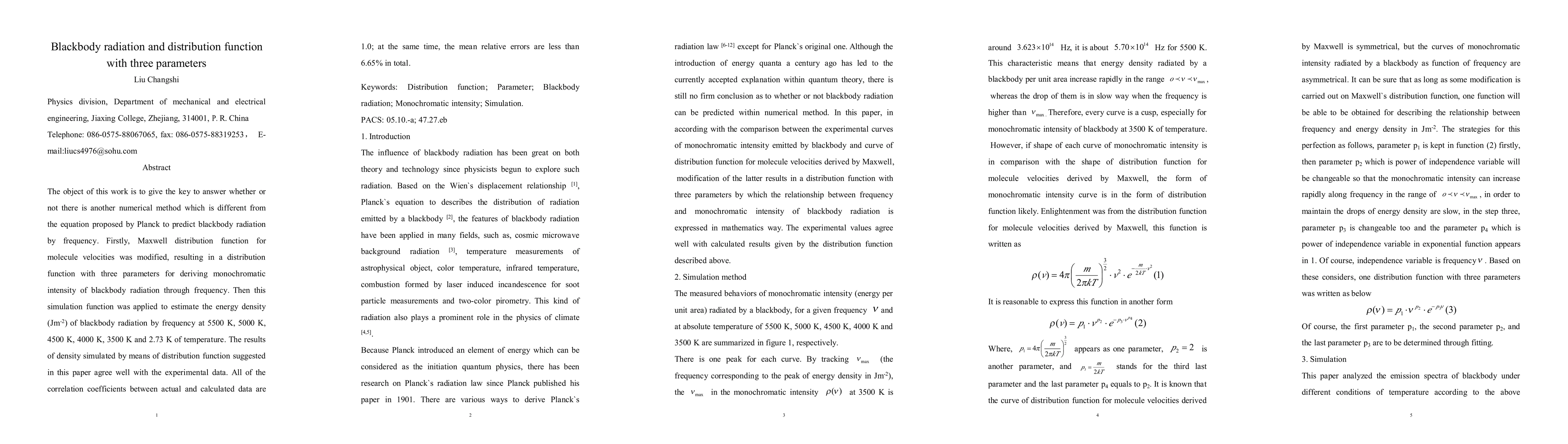 The object of this work is to give the key to answer whether or not there is another numerical method which is different from the equation proposed by Planck to predict blackbody radiation by frequency. Firstly, Maxwell distribution function for molecule velocities was modified, resulting in a distribution function with three parameters for deriving monochromatic intensity of blackbody radiation through frequency. Then this simulation function was applied to estimate the energy density (Jm-2) of blackbody radiation by frequency at 5500 K, 5000 K, 4500 K, 4000 K, 3500 K and 2.73 K of temperature. The results of density simulated by means of distribution function suggested in this paper agree well with the experimental data. All of the correlation coefficients between actual and calculated data are 1.0; at the same time, the mean relative errors are less than 6.65% in total.