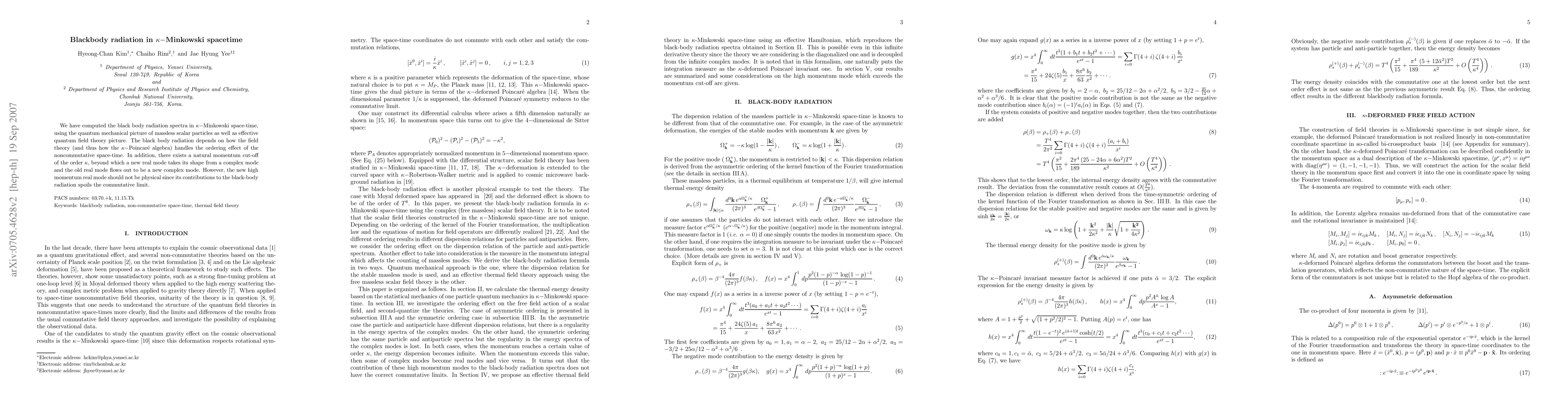 We have computed the black body radiation spectra in $\kappa-$Minkowski space-time, using the quantum mechanical picture of massless scalar particles as well as effective quantum field theory picture. The black body radiation depends on how the field theory (and thus how the $\kappa-$Poincar\'e algebra) handles the ordering effect of the noncommutative space-time. In addition, there exists a natural momentum cut-off of the order $\kappa$, beyond which a new real mode takes its shape from a complex mode and the old real mode flows out to be a new complex mode. However, the new high momentum real mode should not be physical since its contributions to the black-body radiation spoils the commutative limit.