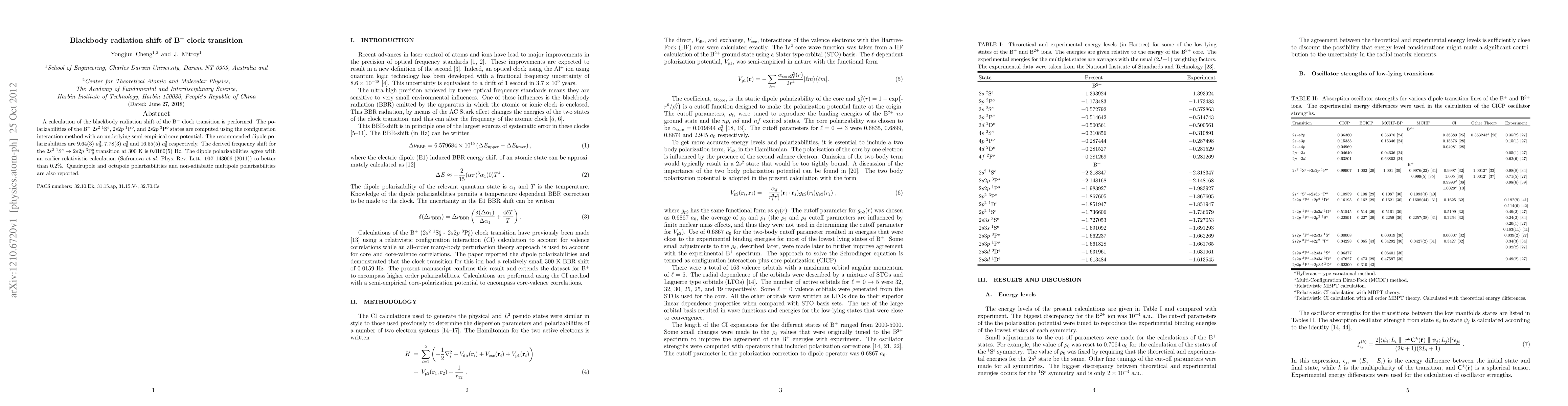 A calculation of the blackbody radiation shift of the B$^+$ clock transition is performed. The polarizabilities of the B$^+$ $2s^2$ $^1$S$^e$, $2s2p$ $^1$P$^o$, and $2s2p$ $^3$P$^o$ states are computed using the configuration interaction method with an underlying semi-empirical core potential. The recommended dipole polarizabilities are 9.64(3) $a_0^3$, 7.78(3) $a_0^3$ and 16.55(5) $a_0^3$ respectively. The derived frequency shift for the $2s^2$ $^1$S$^e$ $\to$ $2s2p$ $^3$P$^o_0$ transition at 300 K is 0.0160(5) Hz. The dipole polarizabilities agree with an earlier relativistic calculation (Safronova {\em et al.} Phys. Rev. Lett. {\bf 107} 143006 (2011)) to better than 0.2%. Quadrupole and octupole polarizabilities and non-adiabatic multipole polarizabilities are also reported.