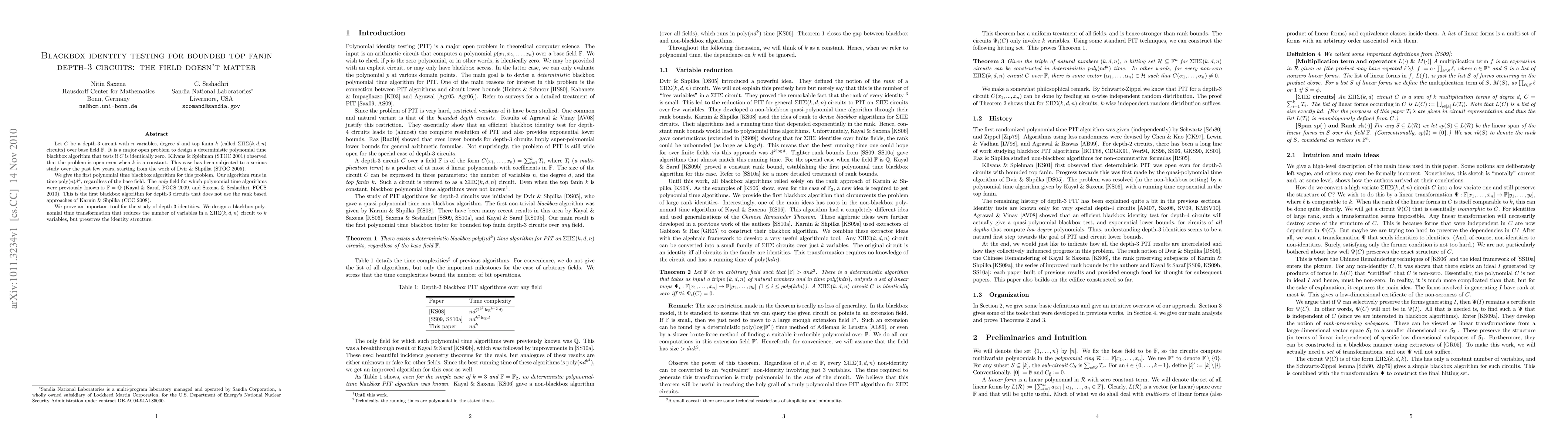 Let C be a depth-3 circuit with n variables, degree d and top fanin k (called sps(k,d,n) circuits) over base field F. It is a major open problem to design a deterministic polynomial time blackbox algorithm that tests if C is identically zero. Klivans & Spielman (STOC 2001) observed that the problem is open even when k is a constant. This case has been subjected to a serious study over the past few years, starting from the work of Dvir & Shpilka (STOC 2005). We give the first polynomial time blackbox algorithm for this problem. Our algorithm runs in time poly(nd^k), regardless of the base field. The only field for which polynomial time algorithms were previously known is F=Q (Kayal & Saraf, FOCS 2009, and Saxena & Seshadhri, FOCS 2010). This is the first blackbox algorithm for depth-3 circuits that does not use the rank based approaches of Karnin & Shpilka (CCC 2008). We prove an important tool for the study of depth-3 identities. We design a blackbox polynomial time transformation that reduces the number of variables in a sps(k,d,n) circuit to k variables, but preserves the identity structure.