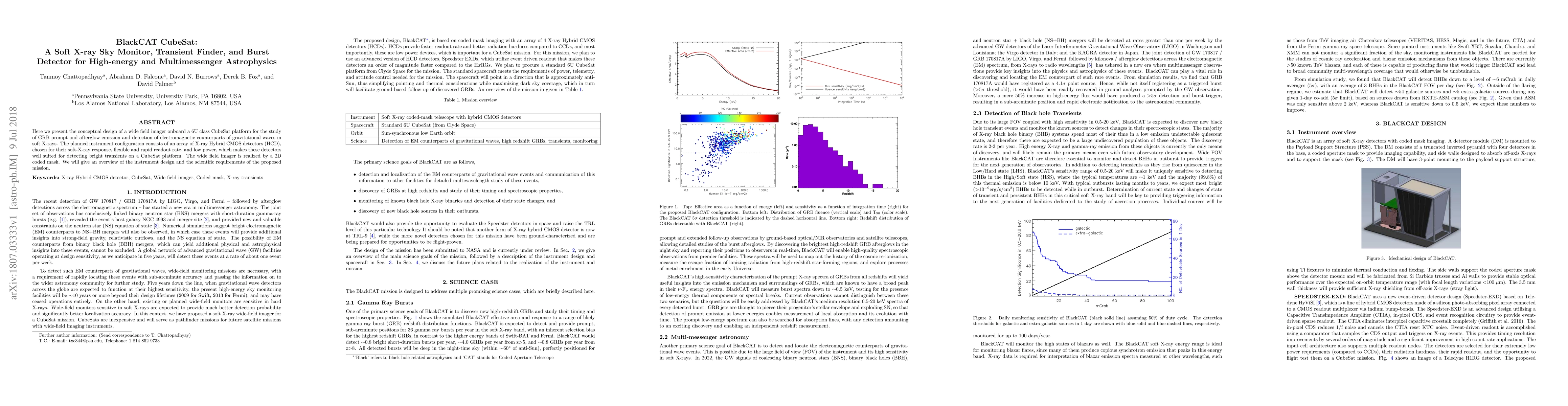 The BlackCAT CubeSat is designed as a 6U CubeSat with a wide field imager for soft X-ray sky monitoring, transient detection, and burst observation, utilizing X-ray Hybrid CMOS detectors and a 2D coded mask for high-energy and multimessenger astrophysics research. The mission aims to study GRB emissions and detect electromagnetic counterparts of gravitational waves.