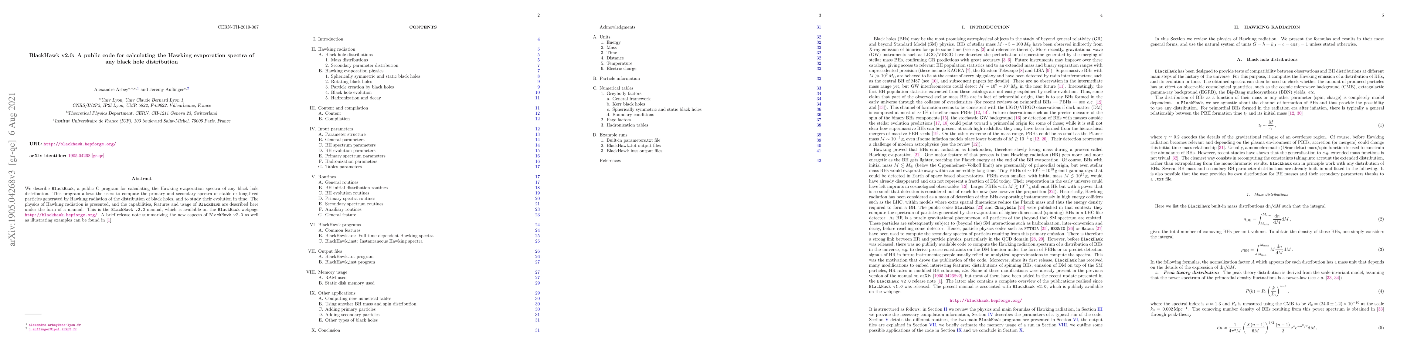 We describe BlackHawk, a public C program for calculating the Hawking evaporation spectra of any black hole distribution. This program allows the users to compute the primary and secondary spectra of stable or long-lived particles generated by Hawking radiation of the distribution of black holes, and to study their evolution in time. The physics of Hawking radiation is presented, and the capabilities, features and usage of BlackHawk are described here under the form of a manual. This is the BlackHawk v2.0 manual, which is available on the BlackHawk webpage http://blackhawk.hepforge.org/. A brief release note summarizing the new aspects of BlackHawk v2.0 as well as illustrating examples can be found in https://arxiv.org/abs/2108.02737.