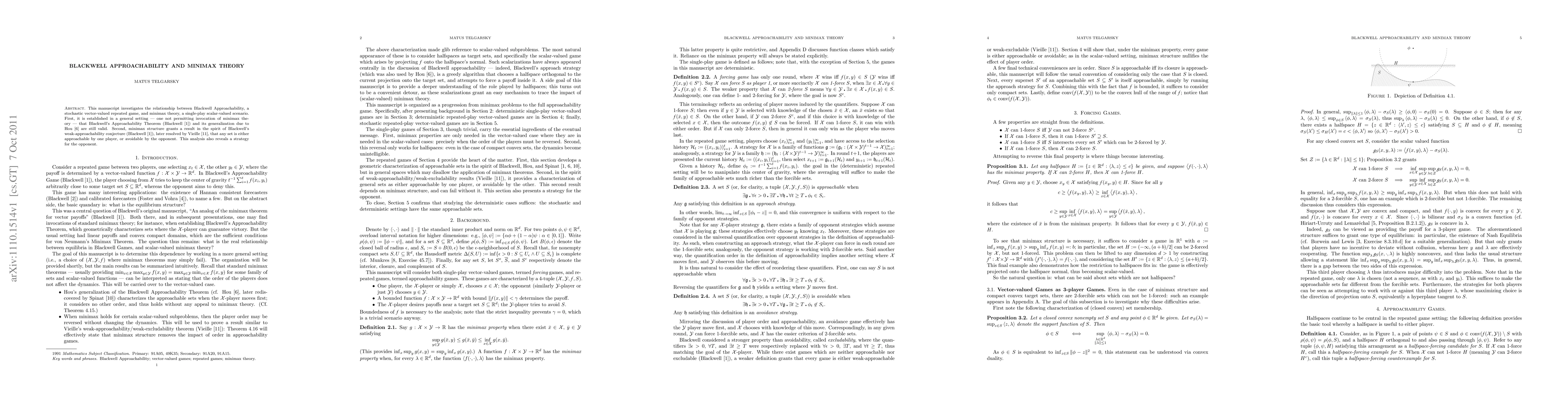 The paper investigates Blackwell Approachability in relation to minimax theory, establishing the validity of Blackwell's Approachability Theorem and its generalization without invoking minimax theory. It also explores the implications of minimax structure on Blackwell's weak-approachability conjecture.