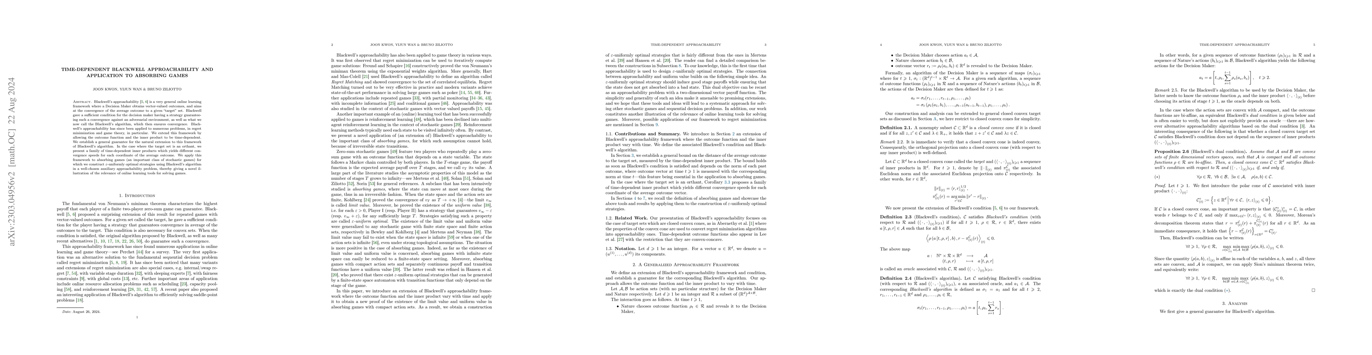 This paper extends Blackwell's approachability framework to accommodate time-dependent outcome functions and dot products, providing a generalized guarantee for Blackwell's algorithm. It applies this extended framework to the Big Match, achieving an $\epsilon$-uniformly optimal strategy for Player I.