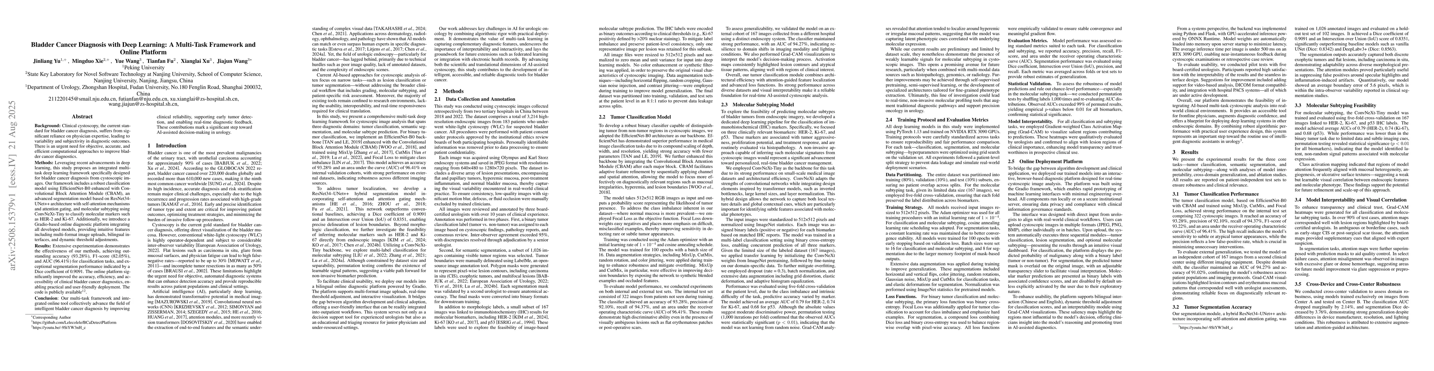 Clinical cystoscopy, the current standard for bladder cancer diagnosis, suffers from significant reliance on physician expertise, leading to variability and subjectivity in diagnostic outcomes. There is an urgent need for objective, accurate, and efficient computational approaches to improve bladder cancer diagnostics. Leveraging recent advancements in deep learning, this study proposes an integrated multi-task deep learning framework specifically designed for bladder cancer diagnosis from cystoscopic images. Our framework includes a robust classification model using EfficientNet-B0 enhanced with Convolutional Block Attention Module (CBAM), an advanced segmentation model based on ResNet34-UNet++ architecture with self-attention mechanisms and attention gating, and molecular subtyping using ConvNeXt-Tiny to classify molecular markers such as HER-2 and Ki-67. Additionally, we introduce a Gradio-based online diagnostic platform integrating all developed models, providing intuitive features including multi-format image uploads, bilingual interfaces, and dynamic threshold adjustments. Extensive experimentation demonstrates the effectiveness of our methods, achieving outstanding accuracy (93.28%), F1-score (82.05%), and AUC (96.41%) for classification tasks, and exceptional segmentation performance indicated by a Dice coefficient of 0.9091. The online platform significantly improved the accuracy, efficiency, and accessibility of clinical bladder cancer diagnostics, enabling practical and user-friendly deployment. The code is publicly available. Our multi-task framework and integrated online tool collectively advance the field of intelligent bladder cancer diagnosis by improving clinical reliability, supporting early tumor detection, and enabling real-time diagnostic feedback. These contributions mark a significant step toward AI-assisted decision-making in urology.