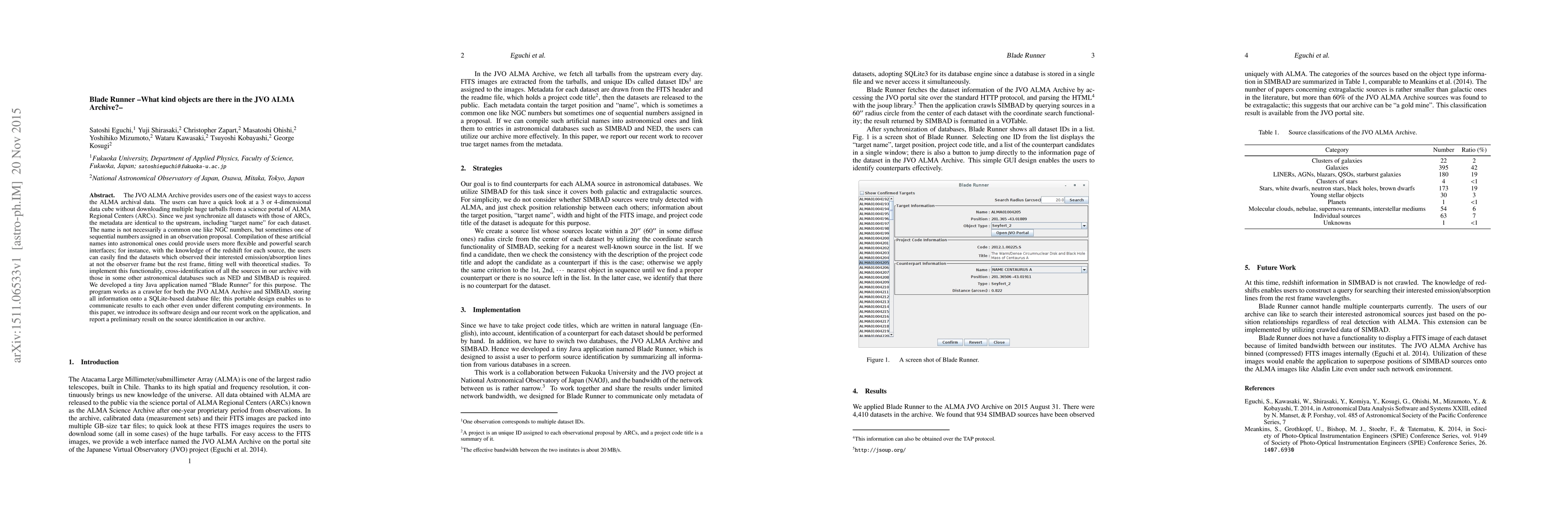 The JVO ALMA Archive offers easy access to ALMA data cubes, but its dataset names are often arbitrary. To enhance search capabilities, a Java application named "Blade Runner" was developed to cross-identify sources with external astronomical databases, aiming to provide a more flexible search interface.