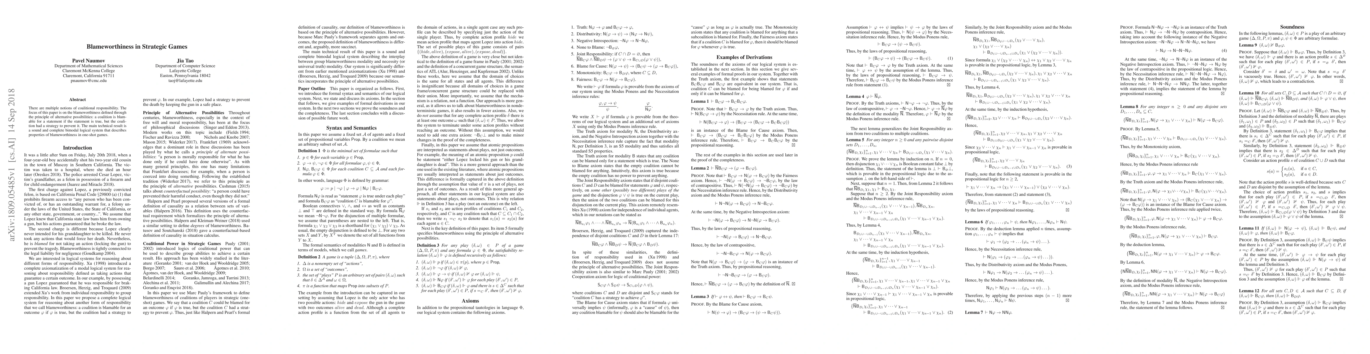 There are multiple notions of coalitional responsibility. The focus of this paper is on the blameworthiness defined through the principle of alternative possibilities: a coalition is blamable for a statement if the statement is true, but the coalition had a strategy to prevent it. The main technical result is a sound and complete bimodal logical system that describes properties of blameworthiness in one-shot games.