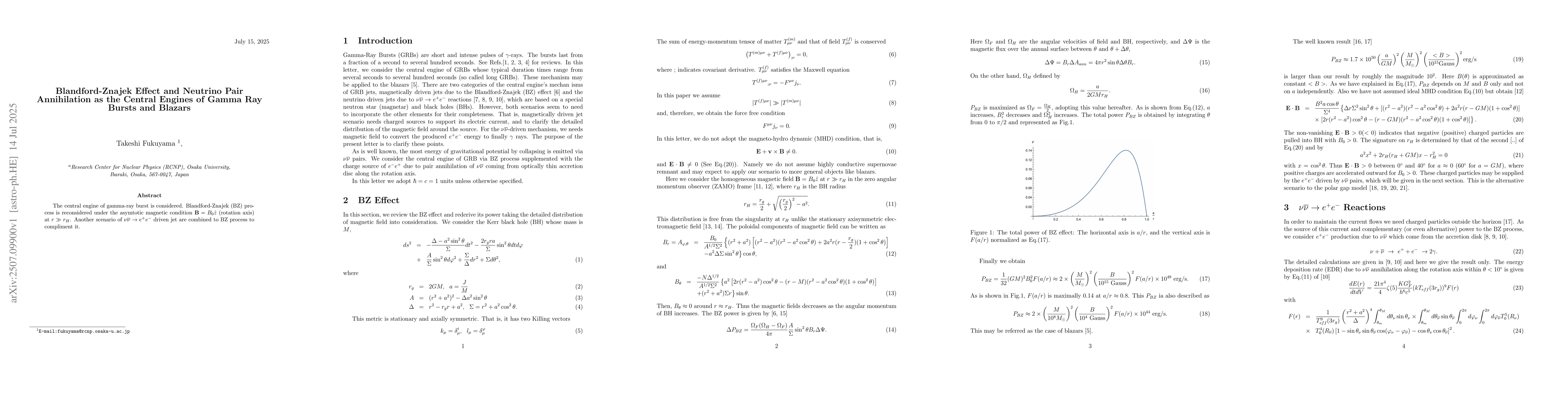 The central engine of gamma-ray burst is considered. Blandford-Znajek (BZ) process is reconsidered under the asymtotic magnetic condition ${\bf B}=B_0\hat{z}$ (rotation axis) at $r\gg r_H$. Another scenario of $\nu \overline{\nu} \to e^+ e^-$ driven jet are combined to BZ process to compliment it.