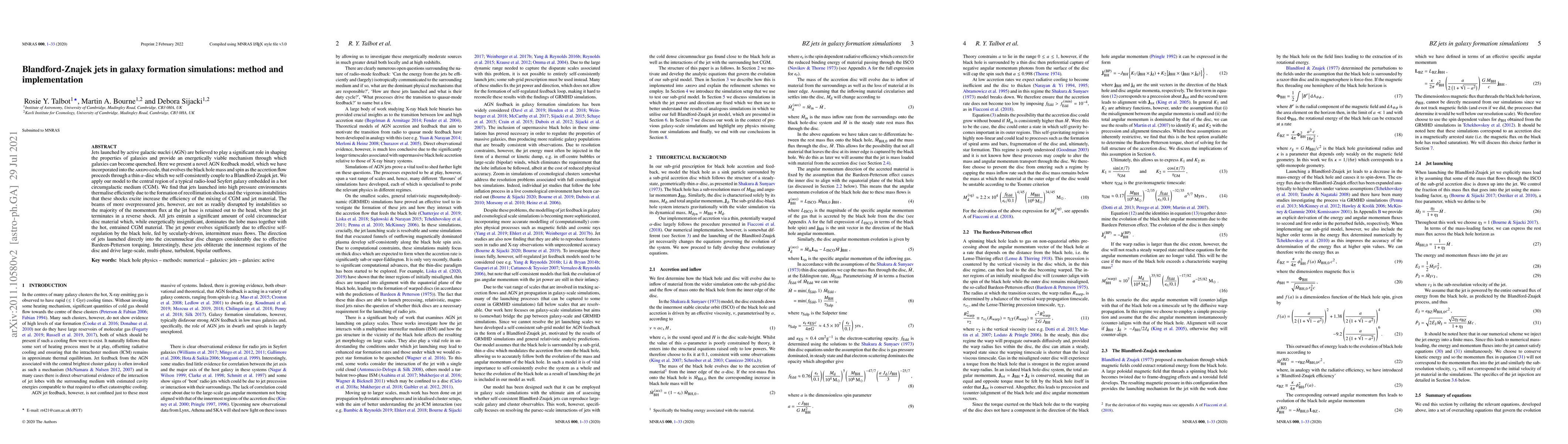 Jets launched by active galactic nuclei (AGN) are believed to play a significant role in shaping the properties of galaxies and provide an energetically viable mechanism through which galaxies can become quenched. Here we present a novel AGN feedback model, which we have incorporated into the AREPO code, that evolves the black hole mass and spin as the accretion flow proceeds through a thin $\alpha$-disc which we self-consistently couple to a Blandford-Znajek jet. We apply our model to the central region of a typical radio-loud Seyfert galaxy embedded in a hot circumgalactic medium (CGM). We find that jets launched into high pressure environments thermalise efficiently due to the formation of recollimation shocks and the vigorous instabilities that these shocks excite increase the efficiency of the mixing of CGM and jet material. The beams of more overpressured jets, however, are not as readily disrupted by instabilities so the majority of the momentum flux at the jet base is retained out to the head, where the jet terminates in a reverse shock. All jets entrain a significant amount of cold circumnuclear disc material which, while energetically insignificant, dominates the lobe mass together with the hot, entrained CGM material. The jet power evolves significantly due to effective self-regulation by the black hole, fed by secularly-driven, intermittent mass flows. The direction of jets launched directly into the circumnuclear disc changes considerably due to effective Bardeen-Petterson torquing. Interestingly, these jets obliterate the innermost regions of the disc and drive large-scale, multi-phase, turbulent, bipolar outflows.