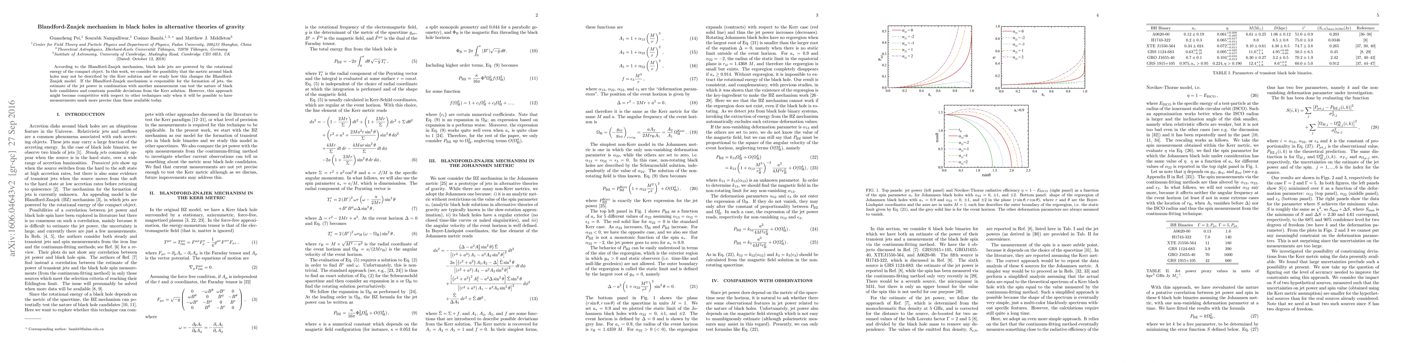 This paper explores how deviations from the Kerr solution in black hole metrics could alter the Blandford-Znajek mechanism responsible for powering black hole jets. It suggests that more precise measurements could help test alternative gravity theories by estimating jet power and constraining deviations from the Kerr solution.