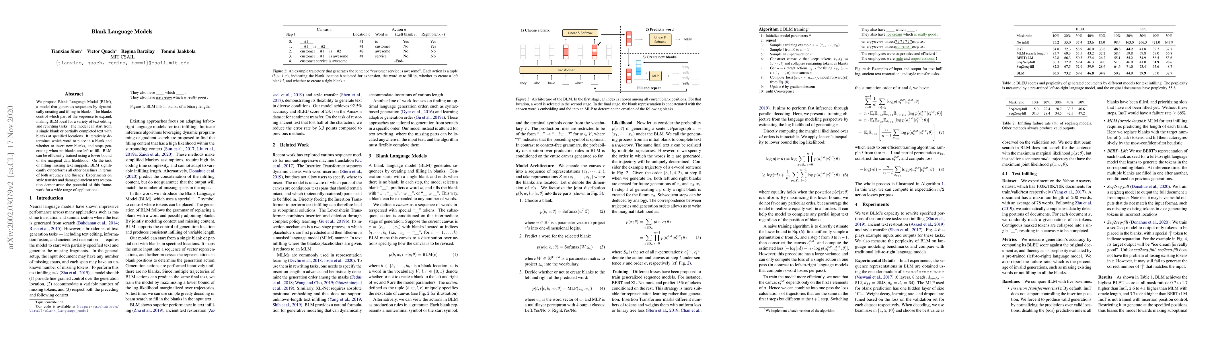 The Blank Language Model (BLM) dynamically generates text by filling blanks, controlling sequence expansion for text editing tasks. It outperforms other models in filling missing text snippets and shows promise in style transfer and ancient text restoration.
