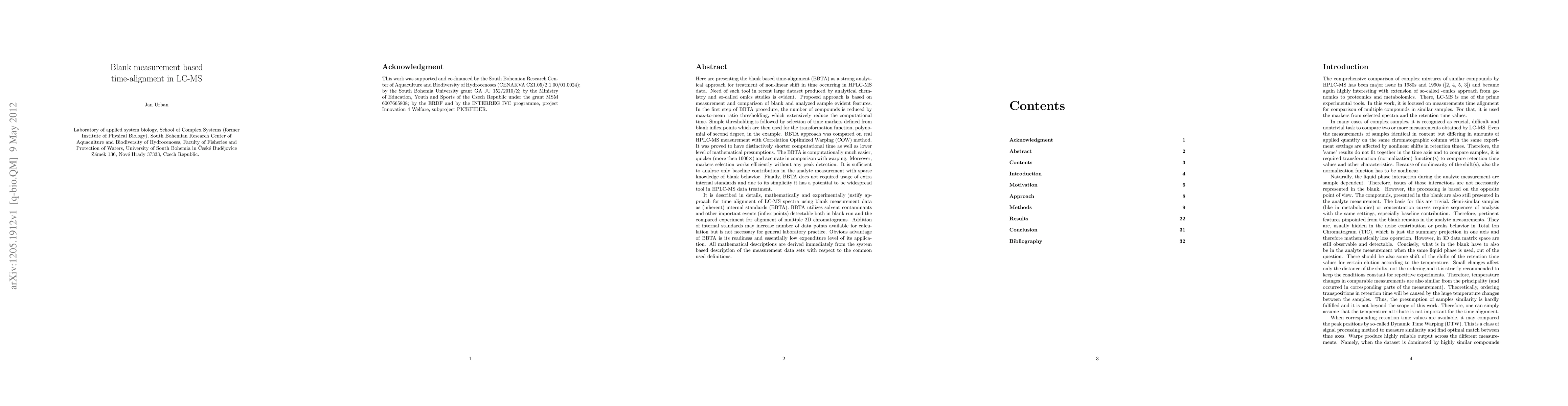Here are presenting the blank based time-alignment (BBTA) as a strong analytical approach for treatment of non-linear shift in time occurring in HPLC-MS data. Need of such tool in recent large dataset produced by analytical chemistry and so-called omics studies is evident. Proposed approach is based on measurement and comparison of blank and analyzed sample evident features. In the first step of BBTA procedure, the number of compounds is reduced by max-to-mean ratio thresholding, which extensively reduce the computational time. Simple thresholding is followed by selection of time markers defined from blank inflex points which are then used for the transformation function, polynomial of second degree, in the example. BBTA approach was compared on real HPLC-MS measurement with Correlation Optimized Warping (COW) method. It was proved to have distinctively shorter computational time as well as lower level of mathematical presumptions. The BBTA is computationally much easier, quicker (more then 1000x) and accurate in comparison with warping. Moreover, markers selection works efficiently without any peak detection. It is sufficient to analyze only baseline contribution in the analyte measurement with sparse knowledge of blank behavior. Finally, BBTA does not required usage of extra internal standards and due to its simplicity it has a potential to be widespread tool in HPLC-MS data treatment.